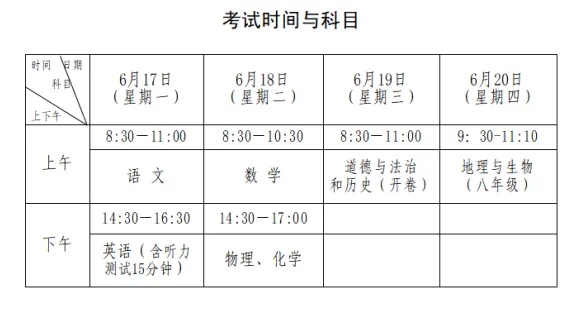 2024年江西中考初三年级文化科目考试时间为6月17日至6月19日,初二年级地理、生物文化考试时间为6月20日上午。今年九江市中考初三年级共有67193名考生报名,初二年级共有62637名考生报名。