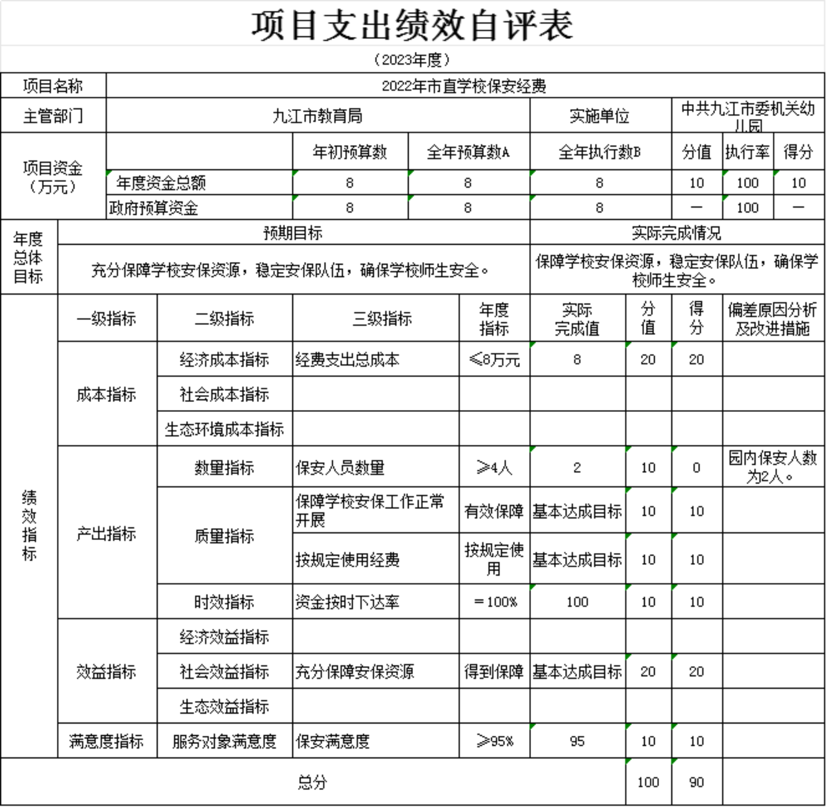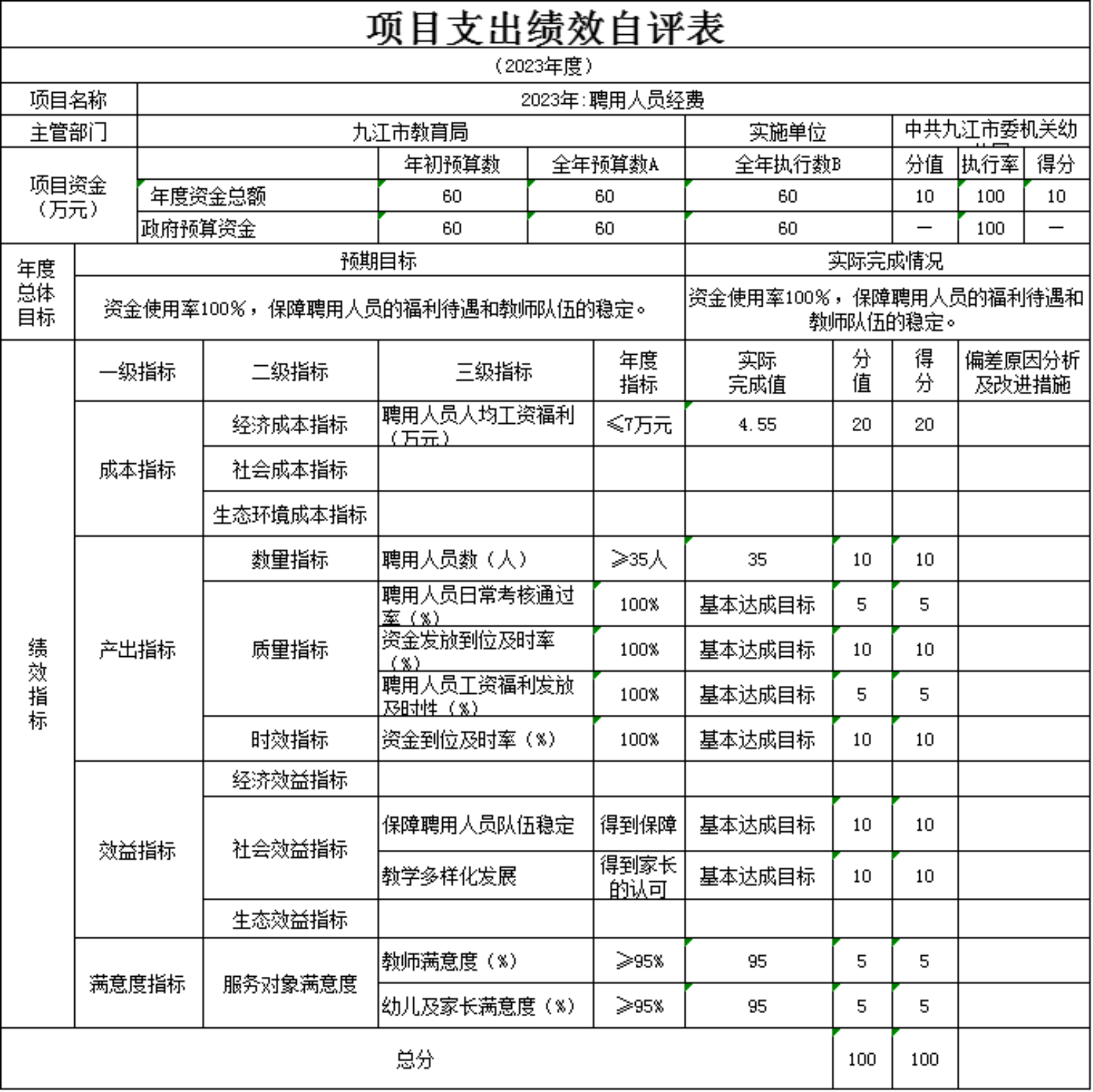 本单位“2023年支持学前教育发展中央补助资金-九财教指(2023)3号项目支出绩效自评表”如下: