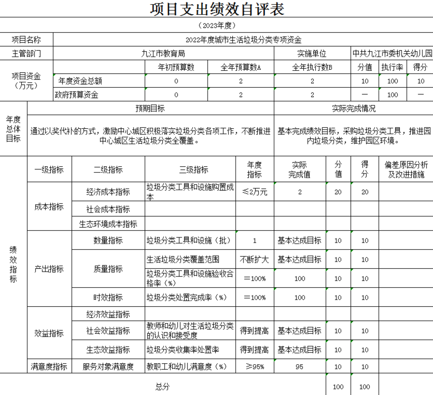 本单位“2022年度城市生活垃圾分类专项资金项目支出绩效自评表”如下: