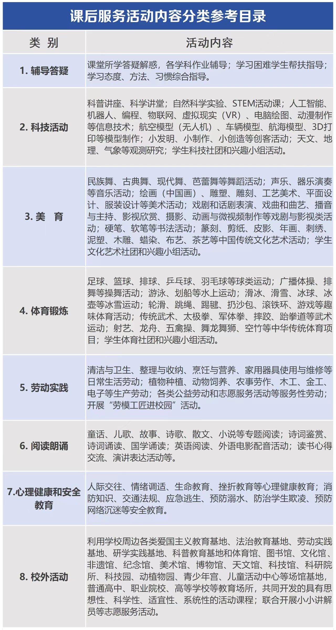 《通知》提供了义务教育学校课后服务内容分类参考目录(附后),分成八个方面。一是辅导答疑类,包括课堂所学答疑解惑,各学科作业辅导;学习困难学生帮扶指导;学习态度、方法、习惯综合指导。二是科技活动类,包括科普讲座、科学讲堂、信息技术、模型制作和创客活动等。三是美育类,包括舞蹈活动、音乐活动、美术活动、戏剧与影视类活动、中国传统文化艺术活动等。四是体育锻炼类,包括球类运动、操舞活动、水上运动、冰雪运动、趣味体育活动、武术运动、中华传统体育项目等。五是劳动实践,包括日常生活劳动、生产劳动、各类公益劳动和志愿服务活动等服务性劳动。六是阅读朗诵,包括专题阅读、诗词诵读、英语阅读、读书心得交流、演讲表达活动等。七是心理健康和安全教育,包括人际交往、情绪调适、生命教育、挫折教育等心理健康教育,消防知识、交通法规、预防溺水等安全教育。八是校外活动,包括利用学校周边各类爱国主义教育基地等场馆基地和普通高中、职业院校、高等学校等教育场所共同开发的具有思想性、科学性、适宜性、系统性的活动课程等。