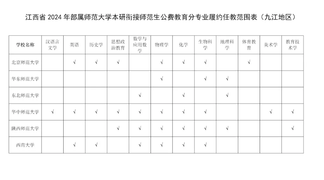 以6所部属师范大学在江西实际投放的招生计划数为准,分专业履约任教范围见附件。
