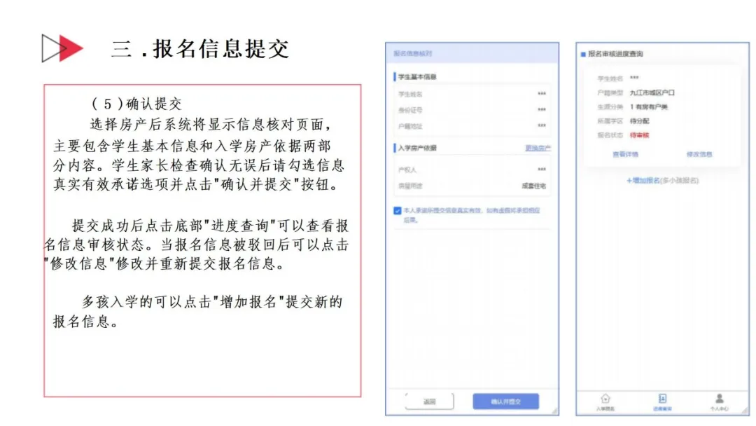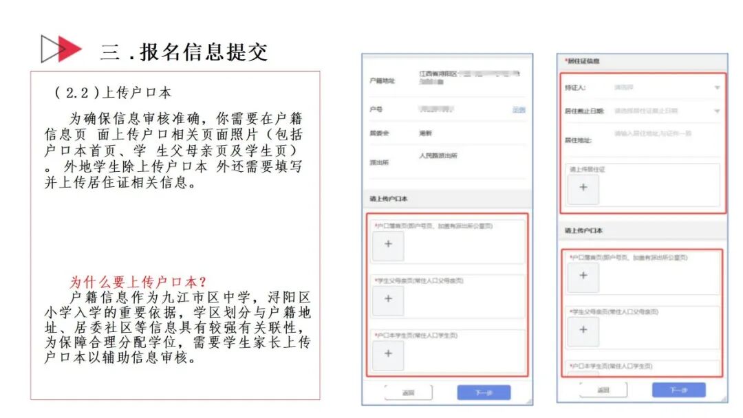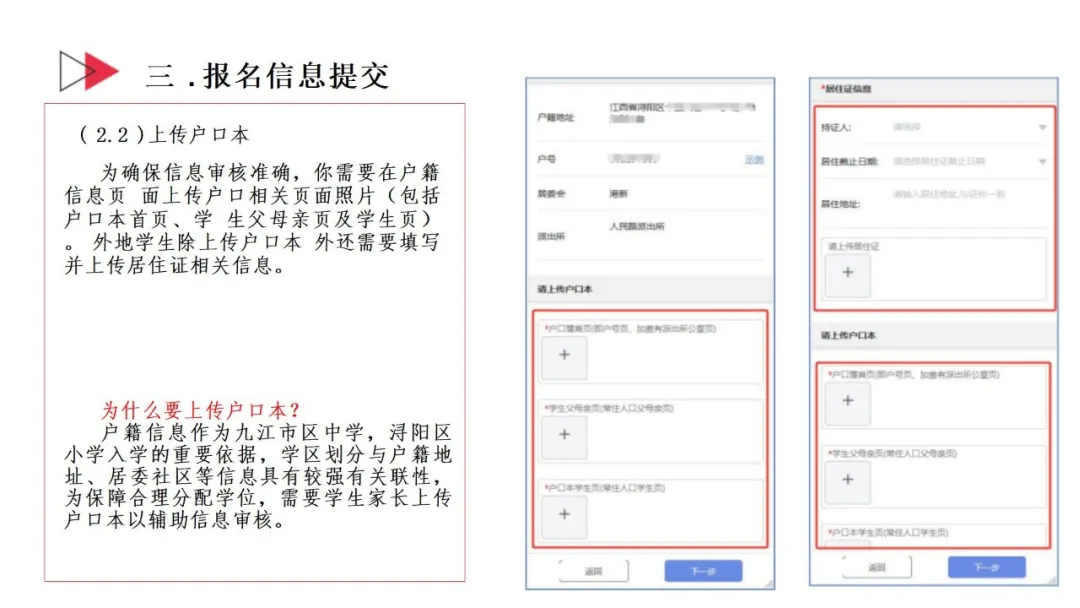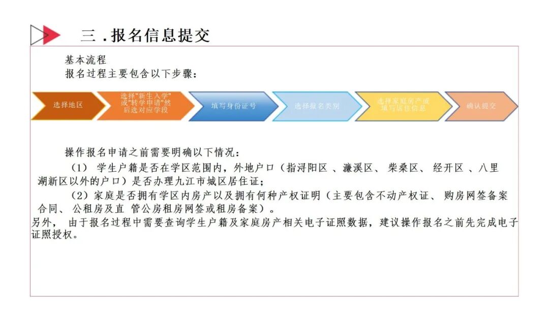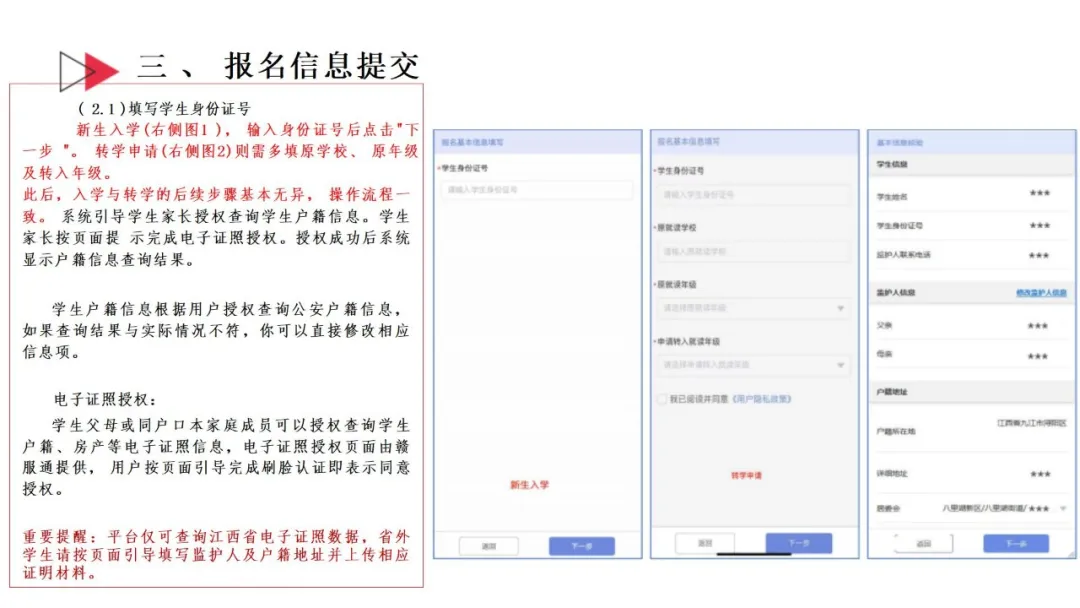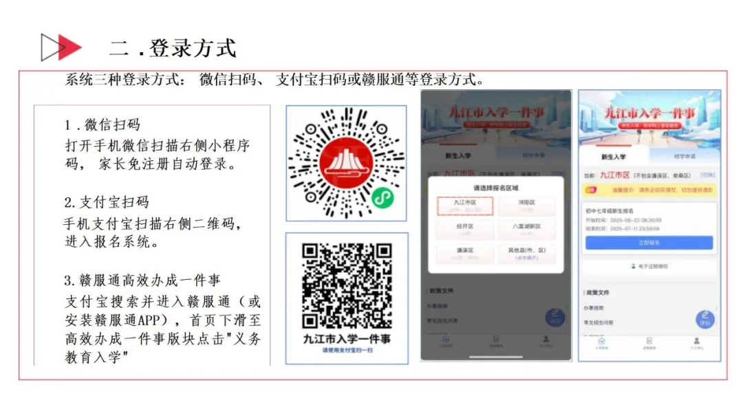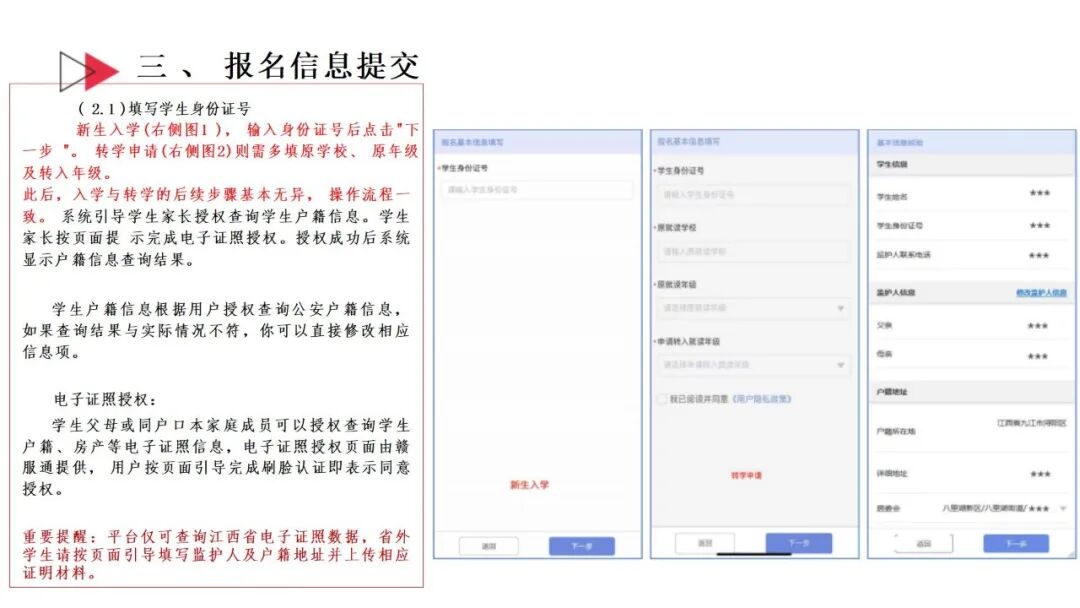 市中心城区"幼升小""小升初"第一次信息采集时间为6月23日至7月11日,第二次信息采集时间为8月1日至8日。家长(需与学生在同一户口本上)可登录赣服通(可通过三种方式登录: 微信登录、支付宝登录 、赣服通高效办成一件事),扫码或者登录直接进入报名系统,通过填写学生身份证号码,经过"电子证照授权"后,系统受理并自动核验学生基本信息,完成报名。