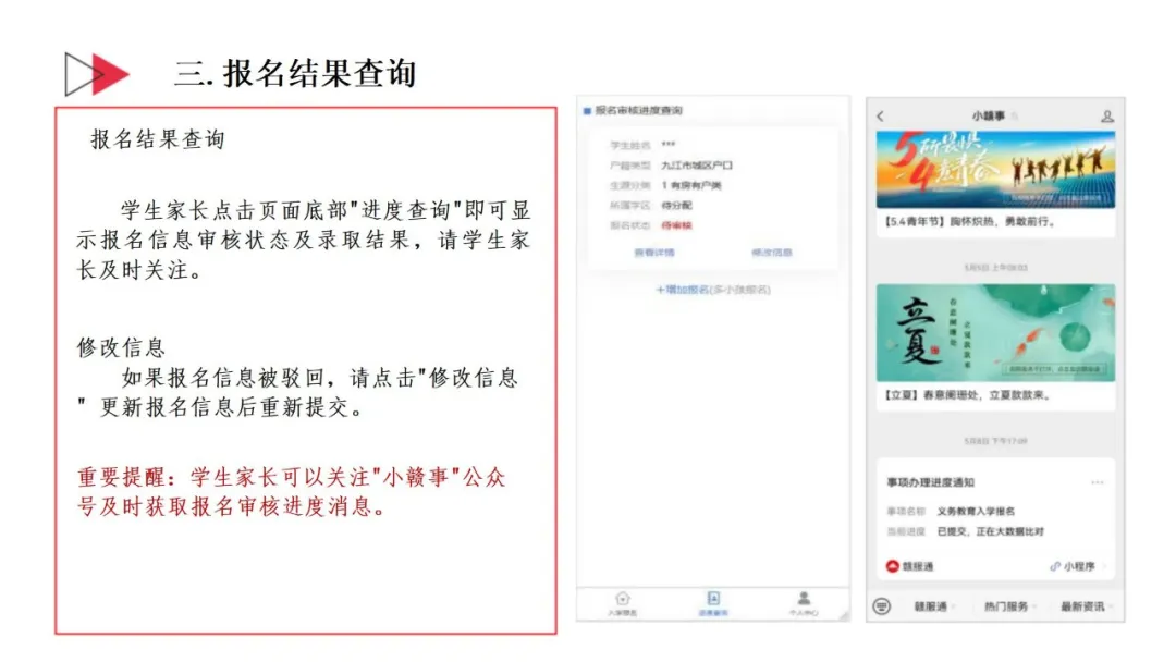 家长可通过赣服通进入招生平台查看所绑定学生的录取学校。录取结果也将通过短信发送至家长注册手机号上,请家长及时查看手机短信,保持信号畅通。