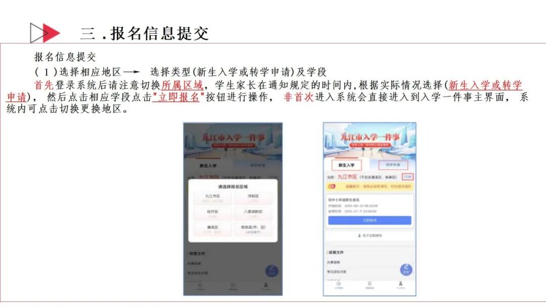 根据省教育厅《江西省义务教育阳光招生专项行动(2025)实施方案》(赣教基字〔2025〕8号)和省教育厅等七部门《义务教育入学"高效办成一件事 "实施方案》(赣教办字〔2024〕4号)等精神,义务教育入学"一件事 "已被列入"高效办成一件事 "2025年度重点事项清单。为进一步提高我市中心城区义务教育招生入学工作科学化、规范化和制度化水平,全面提升我市教育服务效能,2025年,九江市教育局全面启动义务教育入学网上报名工作,并建设完善了"九江市入学一件事"报名系统服务平台。