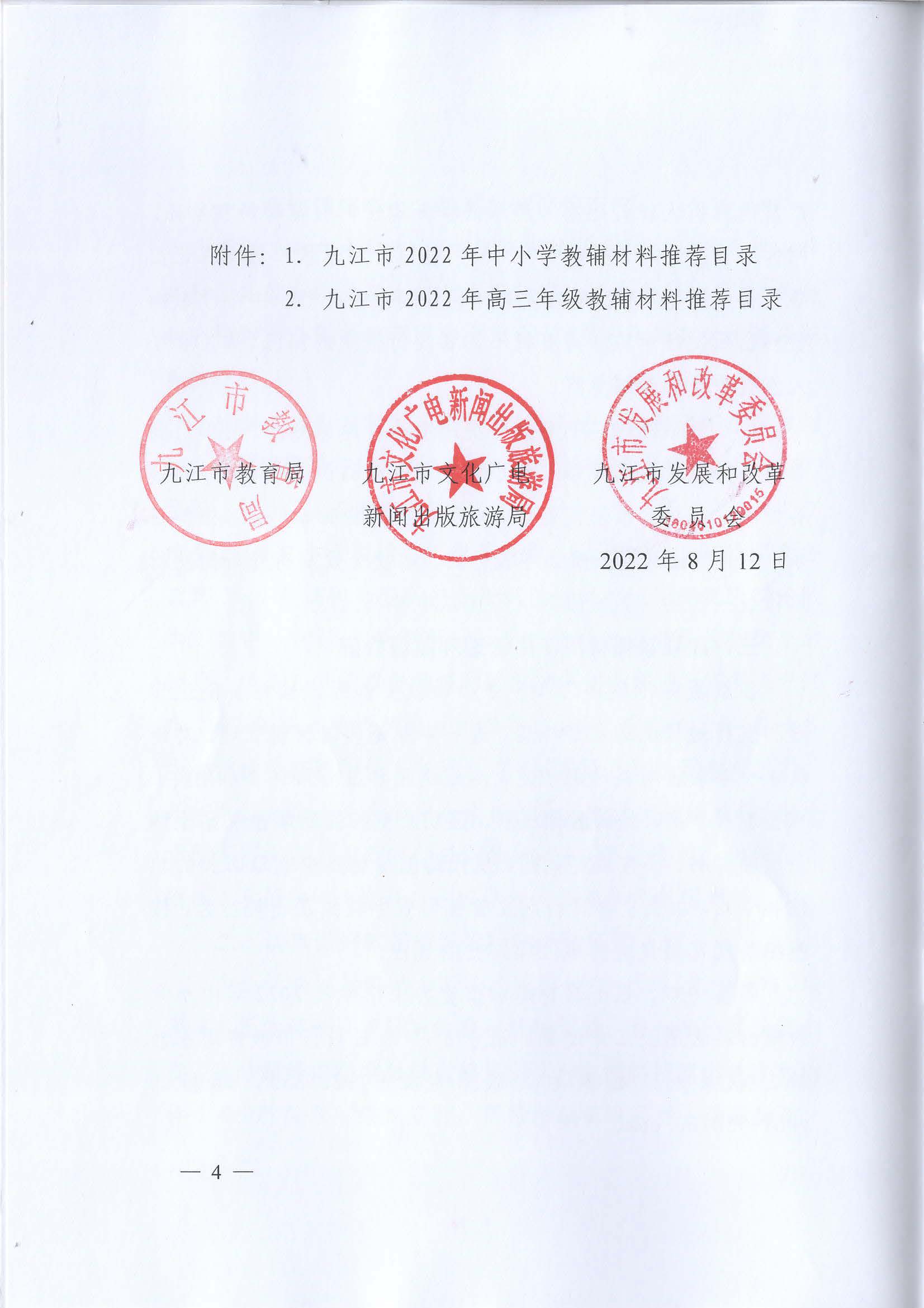 根据江西省教育厅等四部门《关于进一步加强中小学教辅材料使用管理工作的通知》和我市中小学教学实际,2022—2023学年,全市各地各中小学校要按照“一科一辅”要求,从《九江市2022年中小学教辅材料推荐目录》(见附件1)中选用义务教育3—9年级和普通高中各年级教辅材料,不得更换其他版本。其中:2022年秋季高一、高二年级选用与新教材配套的教辅,现高三年级各类教辅材料继续沿用原版本(详见《九江市2022年高三年级教辅材料推荐目录》,见附件2)。各地各中小学校要按照附件1和附件2《推荐目录》选用教辅材料;任何单位和个人不得向中小学校推荐其他任何教辅材料;中小学校不得向学生推荐其他任何教辅材料,更不得统一组织代购附件1和附件2《推荐目录》以外的其他任何教辅材料。
