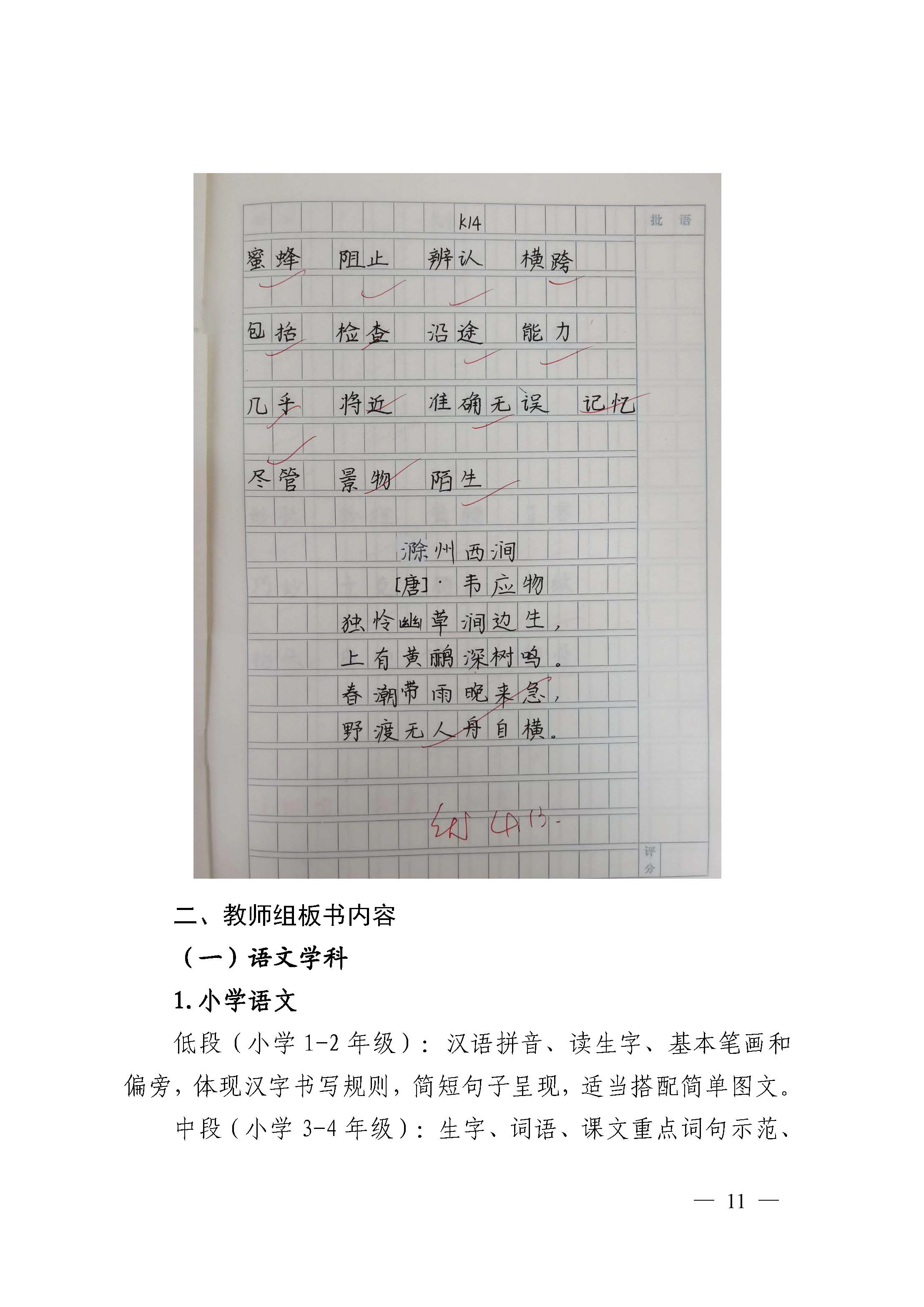3.教师以粉笔书写为主,学生以日常作业为主,重点表现书写轨迹的细节。教师作品为日常课堂板书(每名教师提交3张照片,展现一幅完整板书的完成过程,每张照片“宽413像素*长626像素”不超过250K),提现学科内容,要求板书简明、醒目、集中;布局合理,严谨有序;结构完整,实用有效。学生作品为日常课堂作业(每名学生提交1本作业本),要求字迹端正、规范、不潦草;整体格式美观、大方;能正确提现日常课堂学习内容。