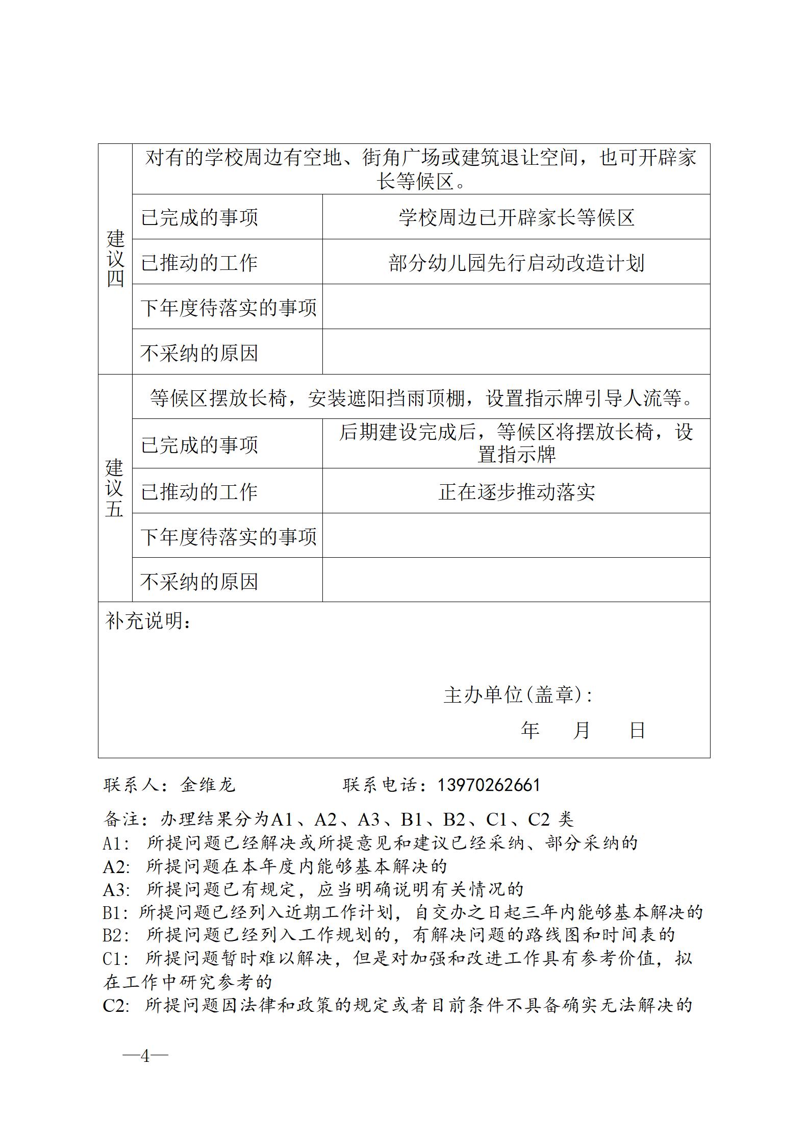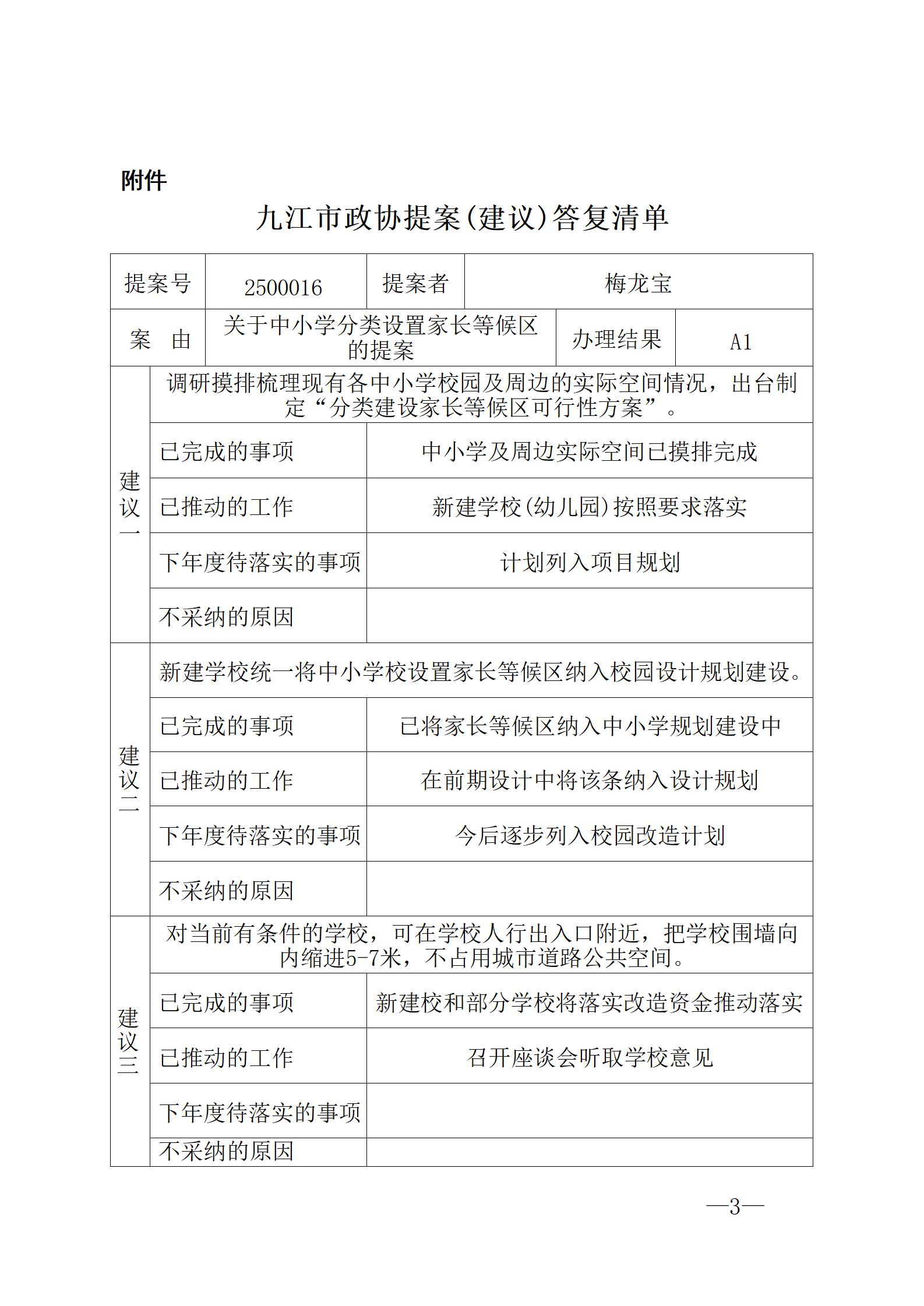 首先非常感谢你对教育的关心、关注,你的提案很有针对性, 从市发改委获悉,九江正在积极推动儿童友好城市建设,你的提 案我们将和发改委、自然资源局、财政局密切协商沟通。从今年 下半年开始,新建中小学将在前期设计中设置家长等候区。等候 区主要设置在学校人行出入口附近,把学校围墙向内部推进5到7 米,不占用城市公共空间,并增设了部分座椅和遮雨棚。前期在 规划设计时就将其纳入。同时让具备改造条件的学校逐步落实, 对于老城区不具备改造条件的,要实事求是的原则,尽量扩充有 效空间,新建地下停车场等方式,租赁等方式来逐步解决。