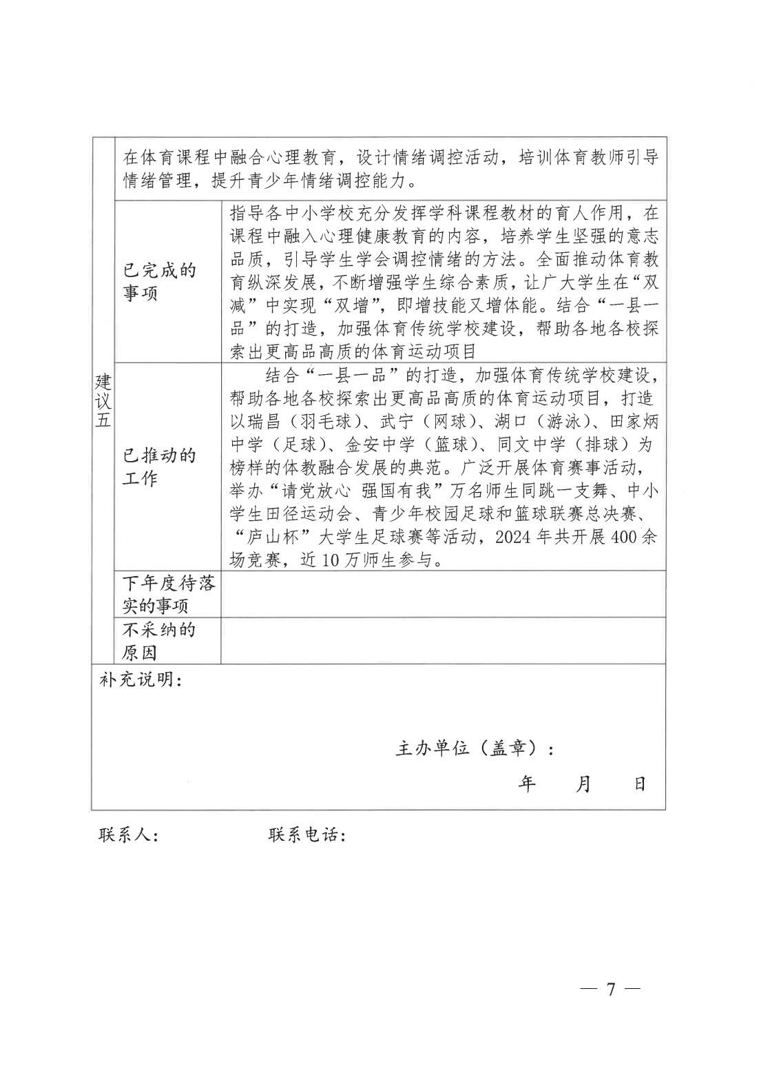 指导各中小学校充分发挥学科课程教材的育人作用,在课程中融入心理健康教育的内容,培养学生坚强的意志品质,引导学 生学会调控情绪的方法。全面推动体育教育纵深发展,不断增强 学生综合素质,让广大学生在“双减”中实现“双增”,即增技能 又增体能。结合“一县一品”的打造,加强体育传统学校建设,帮助各地各校探索出更高品高质的体育运动项目,打造以瑞昌(羽 毛球)、武宁(网球)、湖口(游泳)、田家炳中学(足球)、金安 中学(篮球)、同文中学(排球)为榜样的体教融合发展的典范。 广泛开展体育赛事活动,举办“请党放心强国有我”万名师生同 跳一支舞、中小学生田径运动会、青少年校园足球和篮球联赛总 决赛、“庐山杯”大学生足球赛等活动,2024年共开展400余场竞 赛,近10万师生参与。