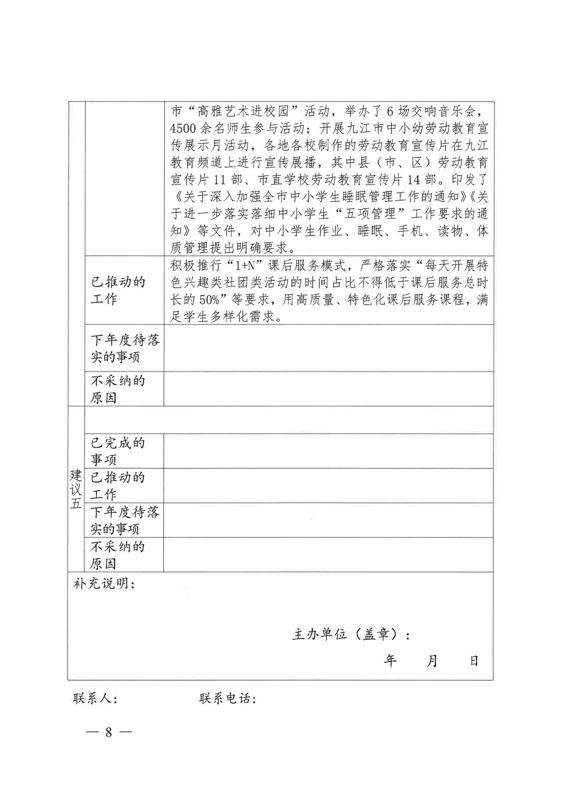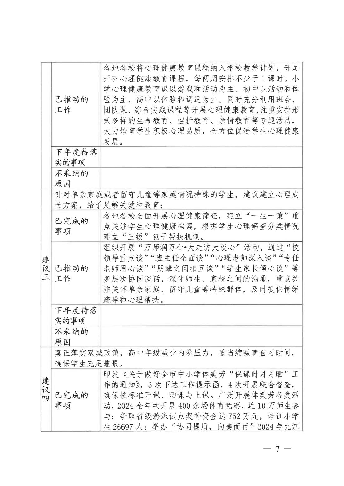 您们在建议中提出的建议具有很强的针对性和指导性,对于我们进一步做好全市中小学心理健康教育工作具有重要指导意义。下一步,我们将聚焦心理健康教育工作中的不足,积极争取 相关职能部门的支持与配合,充分发挥教育、卫健、妇联、团委、公安、社区等部门合力,加快建成家校社协同育人新格局。