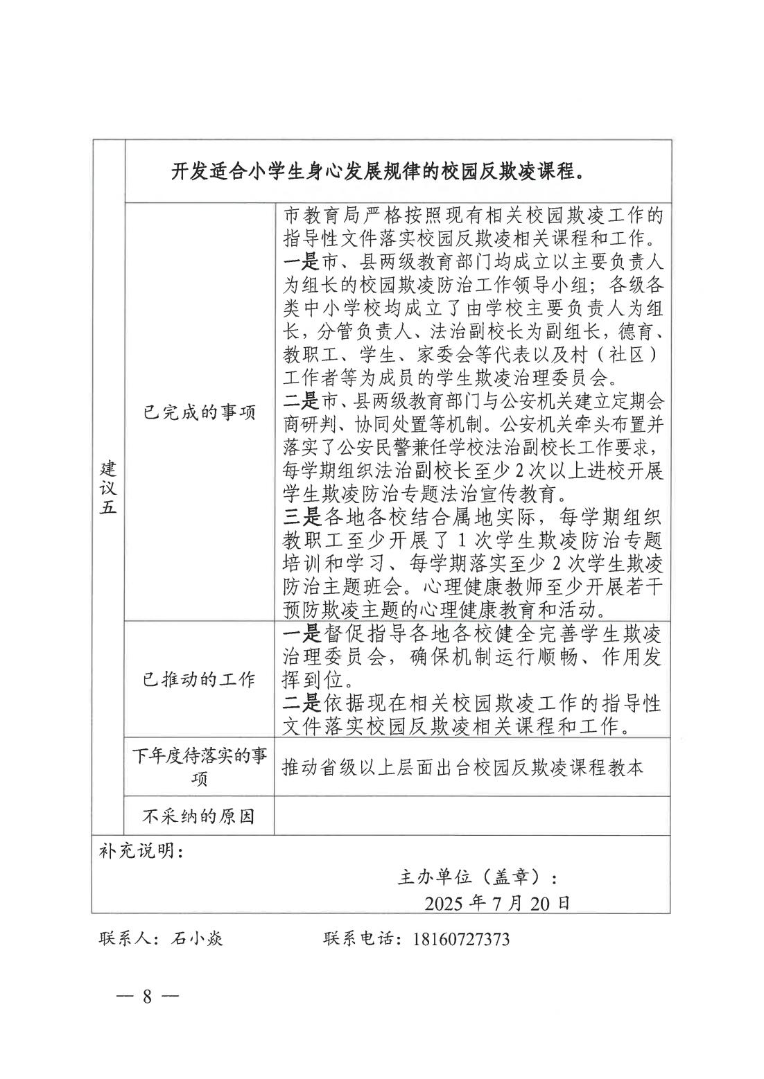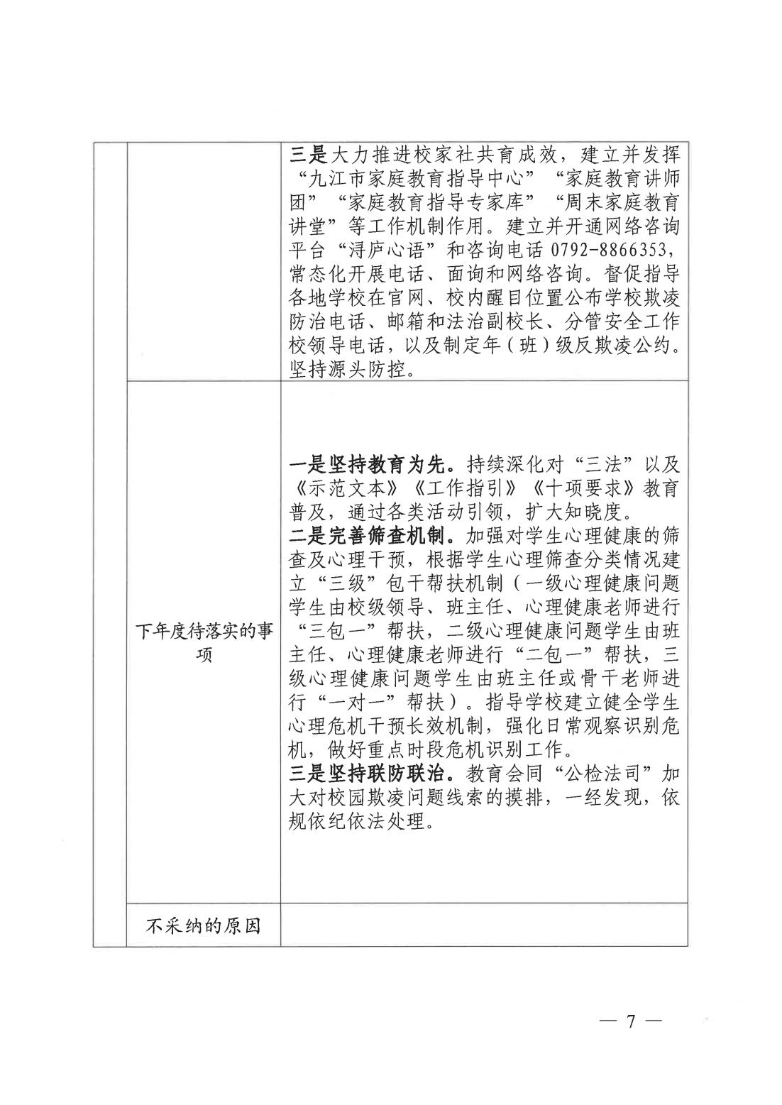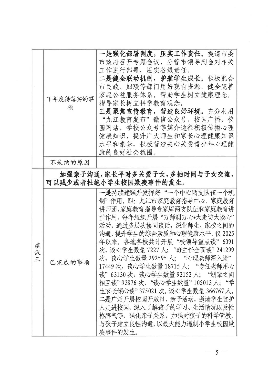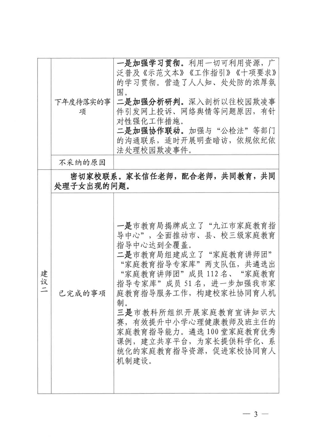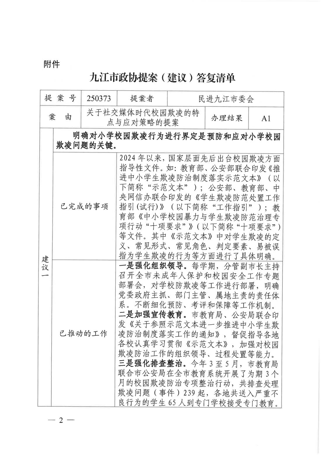 《关于社交媒体时代校园欺凌的特点与应对策略的提案》的提案收悉。九江市教育局高度重视您的提案,认真与您进行沟通 协商,就该提案(建议)办理情况形成答复清单(见附件)。