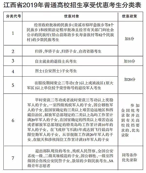 据悉,享受优惠的考生须如实填写《江西省2019年普通高校招生享受优惠考生申报表》,并由考生本人签名承诺所填写内容的真实性。江西省对填写《申报表》考生的资格进行逐级审核。县(市、区)招考办核验证书或证明材料原件,由验证人复印签字盖章,证书及材料原件返回考生。如考生提供证明材料不符合或不齐全,须当场告之不符合原因或需补充的具体材料。其中,烈士子女凭烈士证书及考生与烈士相关联的户籍等佐证材料;归侨、归侨子女、华侨子女考生凭省侨办开具的书面证明;台湾省籍考生凭江西省台办开具的书面证明;自主就业士兵凭户籍所在地的退役军人事务部门的书面证明。由县(市、区)招考办审核造册(附考生证明材料复印件)报设区市招考办(教育考试院)审核后,汇总报省教育厅进行复核。江西省教育厅对全省享受优惠加分考生的资格进行逐一复审,验讫后,《申报表》、有关证书及材料复印件退回县(市、区)招考办用于考生建档。 此外,将对享受加分优惠的5类考生须进行分级公示,应届考生由就读中学在学校网站和班级公示,往届考生由县(市、区)招考办网上公示,公示时间不少于10个工作日。公示无异议后,由县(市、区)招考办统一上报所在设区市招考办(教育考试院)。各设区市招考办(教育考试院)进行网上公示后(公示不少于10个工作日),于6月13日前将《江西省2019年普通高校招生享受优惠考生名册》和考生《申报表》、有关证书或材料复印件上交省教育厅进行复审。江西省教育厅对经复审合格的考生名单统一在“江西省教育考试院网”上进行公示,公示时间为6月16日-30日。公示考生的信息包括姓名、性别、考生号、就读中学(或单位)、享受优惠类别、资格条件、加分分值等。 需要注意的是,在普通高校招生享受优惠考生申报工作中,凡提供虚假个人信息或申请材料的,均认定为在国家教育考试中作弊,取消其相关类型招生的报名、考试资格,同时取消其当年高考报名、考试和录取资格,并视情节轻重给予暂停参加各类国家教育考试1-3年的处理。教育系统、国家机关工作人员及其他部门工作人员在出具、审查、审定考生的报名资格证件、证明等材料中弄虚作假,徇私舞弊,或帮助考生虚报、隐瞒、伪造、变造有关材料的,要依据《中国共产党纪律处分条例》《行政机关公务员处分条例》《事业单位工作人员处分暂行规定》《普通高等学校招生违规行为处理暂行办法》等相关规定严肃处理。涉嫌违法犯罪的,移送司法机关追究法律责任。