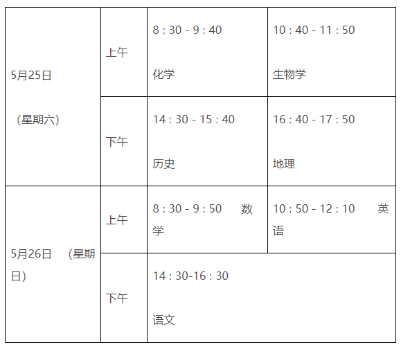 5月25日至26日考试。本次考试全省统考开考科目为7科:语文、数学、英语、化学、生物学、历史、地理。高一年级(2023级)学生本次考试科目为:化学、生物学、历史、地理共4门。高二年级(2022级)学生本次考试科目为:语文、数学、英语共3门。体育与健康科目考试,由各设区市按照有关要求组织实施,高二年级(2022级)学生须报名参加。