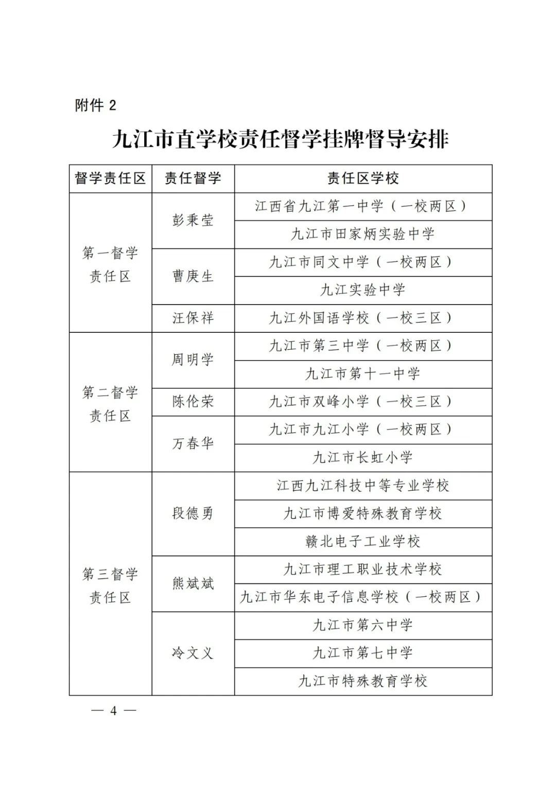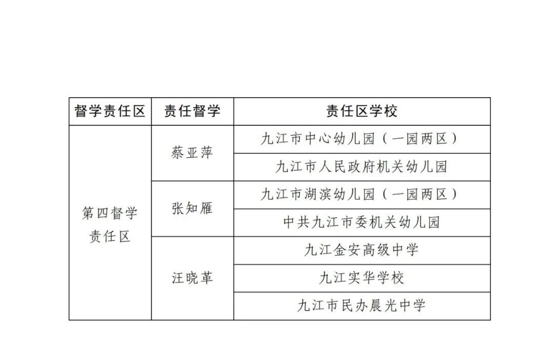 按照国务院《督学管理条例》、教育部《督学管理暂行办法》以及国家、省、市关于中小学校、幼儿园责任督学挂牌督导有关文件要求,为进一步加强教育督导队伍建设,提高教育督导工作水平,更好地服务于打造“公平、优质、全面、融合”的新样态九江教育,经组织遴选,市政府教育督导委员会办公室研究,决定聘任段德勇等12名同志为新一届九江市直学校责任督学。根据市教育局直属学校(共25所学校、36个校区)学段、布局、规模等情况,划分4个督学责任区,每个督学责任区配备3名责任督学。具体见附件。