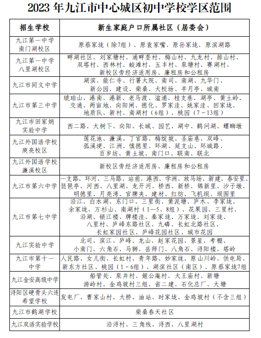 根据《中华人民共和国义务教育法》和教育部、省教育厅关于义务教育阶段坚持免试就近划片入学原则,结合《九江市2023年中小学招生工作实施意见》(九中招委字〔2023〕1号)精神及我市中心城区学生生源分布的实际情况,市教育考试中心依据各初中学校招生计划进行科学统计、统筹谋划,拟定了我市2023年中心城区(浔阳区、经开区、八里湖新区,下同)初中学校学区(见附表),经认真审查并报市中招委研究批准,现就学区范围划分和录取有关事项通知如下: