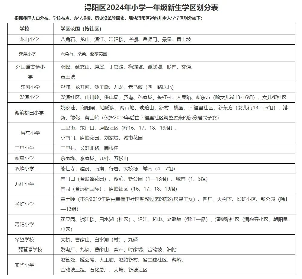 1.区一小:王家凹小区、十里村肖家河、螺子山小区、汽运宿舍、十里华府、十里银都、恒大御景、十里小学宿舍楼、幼儿园综合楼、德化小区、九莲新苑小区、公交修理厂、新天地公馆、中体奥城国际小区、碧桂园九玺小区、黄土岭安置小区、碧桂园天玺小区、中辉学府小区、中辉半山墅、柳家垅。2.爱华小学:爱华新村、香域半山小区、德化名邸小区、谢家垅小区。3.双峰小学濂溪区校区:极地盛世名都小区、南山雅苑小区、匡庐苑小区、九江学院本部教职工宿舍住宅小区、东城村(8、9、10、11、14、15、20、21、22、23、24组)、螺子山村(1—5组)、国棉二厂生活一区、国棉二厂生活三区、海扬小区、杨家洼安置小区(拆迁安置户)、龙庭花园小区、宝梁花园、颐年城小区、学府雅苑小区。4.区二小:仪表小区、七O七小区、浔海花园、十里印象、电子材料厂宿舍、工商局宿舍、人民大厦、消防队宿舍、宴宾楼、十里街道宿舍、农房大厦、市政宿舍、农业银行宿舍、工商银行宿舍、鑫城大厦、信用社宿舍、慧龙新城小区、九职小区、万众佳园小区、香域半山小区、十里河岸小区、乾坤楼、遂沁花园小区、交通局宿舍、小洼、财政局宿舍、交警三大队宿舍、审计局宿舍、工信委宿舍、联盛十里老街小区、戛纳小镇、邮电公寓、赣北木材厂、建行宿舍、桃源苑、七一三小区、玫瑰花园、安福大厦、水木清华小区、德化名邸小区、毛纺街、华东市场、慧龙家园。5.区三小:汪家河、十里新村、吴家山安置小区、一组新村、赣北商城小区、上海路小区、上海南街小区、一方天片区、公安局宿舍、检察院宿舍、法院宿舍、防疫站宿舍、新村私房、九玻小区、政府宿舍、花园小区、莱茵美郡小区、优品尚城小区、海后家属院、空后家属院、浔海十里蓝山小区、万诚中央公园小区、联盛朗香廷小区、奥克斯缔壹城小区、怡嘉苑小区、南山名苑小区、城建局宿舍、柴桑花园、物资局宿舍、立新小区、卫生局宿舍、极地名邸小区、南山明珠小区、国豪美庐湾小区、朗境东方小区、山居水岸小区。6.区外国语学校(小学部):中铁四局小区、长虹小区、泉港雅居、中房小区、天宏商住楼、长虹现代城一期、馨苑山庄、龙惠花城、二六七小区、锦城嘉园小区、七星大厦、长虹现代城二期(佳和苑)、建行宿舍、海伦堡小区、 长安华厦、广电佳苑、昌龙花园、小康苑、江铜宿舍、铁路新村、铁欣画苑、城市晶典小区、孙家垅小区。7.怡康学校(小学部):五里街道五里村1组和17组、五里桥安置小区、桃李苑、紫荆苑、怡康苑、信华美日阳光花园、五里街道八里村1组、2组、4组和5组、西洋垅安置点小区、虞家河乡鲁板村林木场、鲁板村4组、亿荣水晶苑小区、柏林印象、阳光100、竹苑、东方紫薇城、浔城明珠小区、庐山苑小区、浔海金色家园、樱花苑、青春80小区、美的铂悦府、文博苑小区(中基文博府)、星悦城、恒大悦澜庭小区、保利壹号公馆、五里村(1、7、8、9、10、11、15、16、17组)。8.新城学校:加州风情小区、怡居苑、宋家牌楼安置房(一、二期)、怡芳苑、庐山新城小区、五里村(2、3、4、5、6、12、13、14组)、鄱湖家园小区、虞家河侯白垅安置点、虞家河郭桥村(四组、五组)、郭桥村安置点(老宋家牌楼)、山湖村、东投书香濂溪小区、中海国际。9.南湖小学:南湖新村、龙鑫花园、南湖小区、虹桥公寓、东方俊园、富华小区、长虹花园、宏大五金城、裕泰园小区、华宝豪庭、荷花垄安置小区、下五里桥(大桥宿舍)、信用社宿舍、油脂公司宿舍、残联宿舍、新纪元社区、华宝佳苑小区、城市晶典小区、工行宿舍、美的金科华府小区、龙珠花园小区、荷花苑小区、尚城国际、三水厂、劳动部宿舍、三垅村。10.五里中心小学:八里村(除1组、2组、4组和5组)、陶洼新村、德化国际、怡和苑小区、浔安小区、阳光365小区、浔南安置小区。12.浔南小学:远洲九悦庭小区、国豪山景城小区、理想家园小区、中茂铂宫小区、丽景家园小区、浔南悦都小区、中辉世纪城小区、悦隽中央公园。13.德化学校(小学部):新湖庐山国际小区、万达华府小区、浔南名邸小区、八里坡安置小区、汇贤雅居小区(中基壹号)。14.南山学校(小学部):轻机厂小区、动力小区、九柴社区(原九柴厂居委会)、江塑小区、十里蓝山悦城、公元九墅。15.莲花中心小学:妙智村、太平村、怡溪苑小区、妙莲小区、妙智小区、莲花村、江氧居民区、水泵厂、龙门村(1组、2组、4组、5组、6组、7组、8组)、庐山乳胶厂、庐山无线电厂、保利庐山林语小区、庐山御府小区、莲花镇镇政府宿舍。16.爱莲小学:新桥村、龙门村9组、华声居民区、龙门小区、庐山砂轮厂原居民、贺家垅小区、山水天宸。17.莲花东城小学:东城村(1—7组、12—13组、16—19组)、长化居民区、林科所居民区。18. 区一小学院校区(谭畈小学):谭畈村、潘湾村。20.虞家河中小学(小学部):怡濂苑、芳兰美庐小区、开天村、民生村、大桥村、东光村、鲁板村、虹桥社区。21.姑塘中小学(小学部):蔡岭村、周岭村、沿湖村、广桥村、邓桥村、香积村、谷山村(除8组和9组)、沙湖村、姑塘社区。22. 东湖学校(小学部):化纤厂社区、姑塘镇谷山村8组和9组、青山码头。23.高垅中小学(小学部):高垅居委会、五星村、青山村、双垅村。24.新港中
