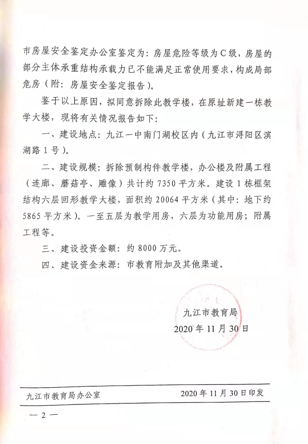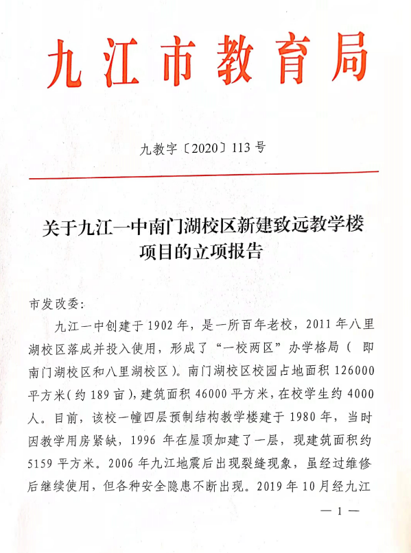 关于九江一中南门湖新建致远教学楼项目的立项报告
