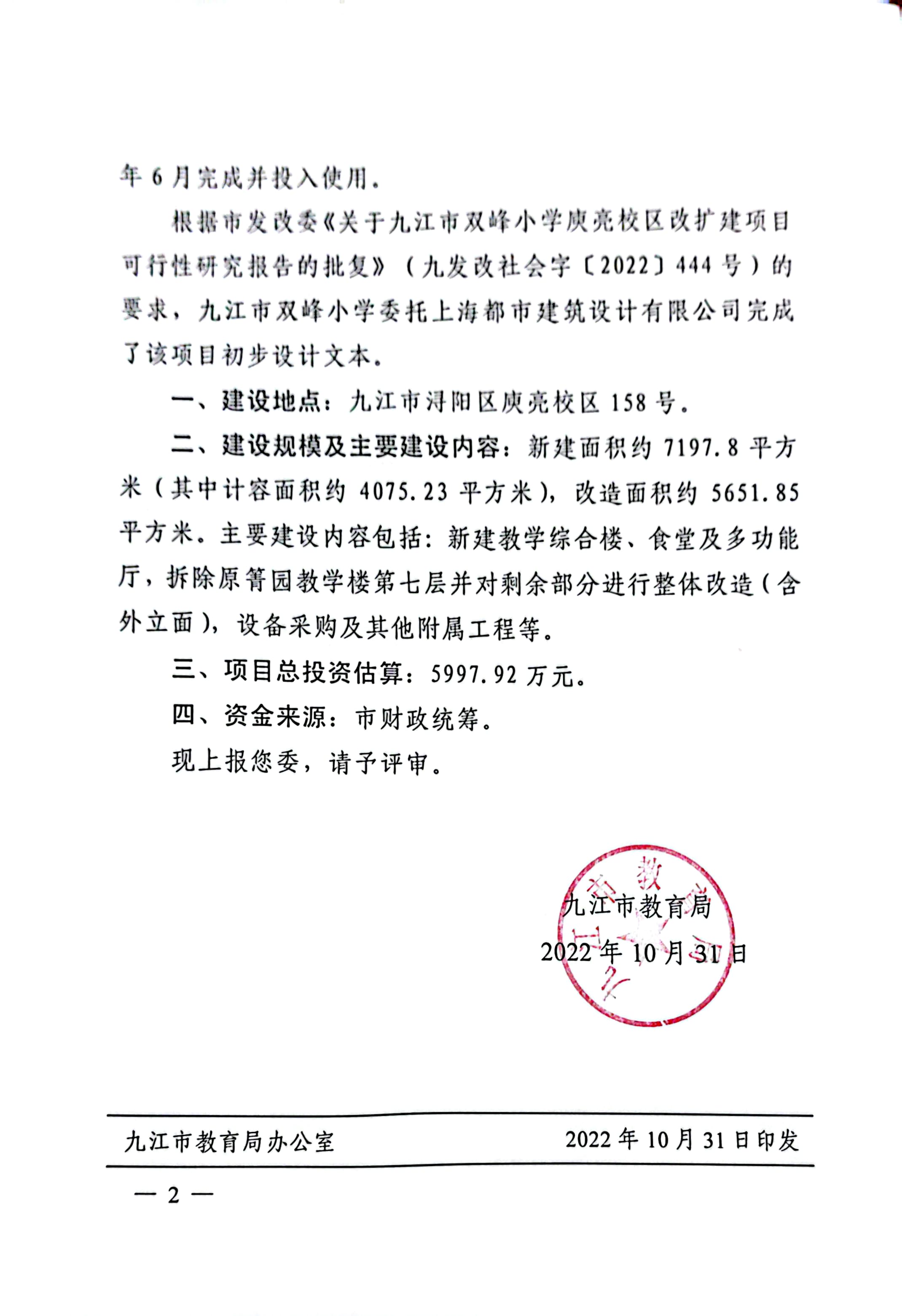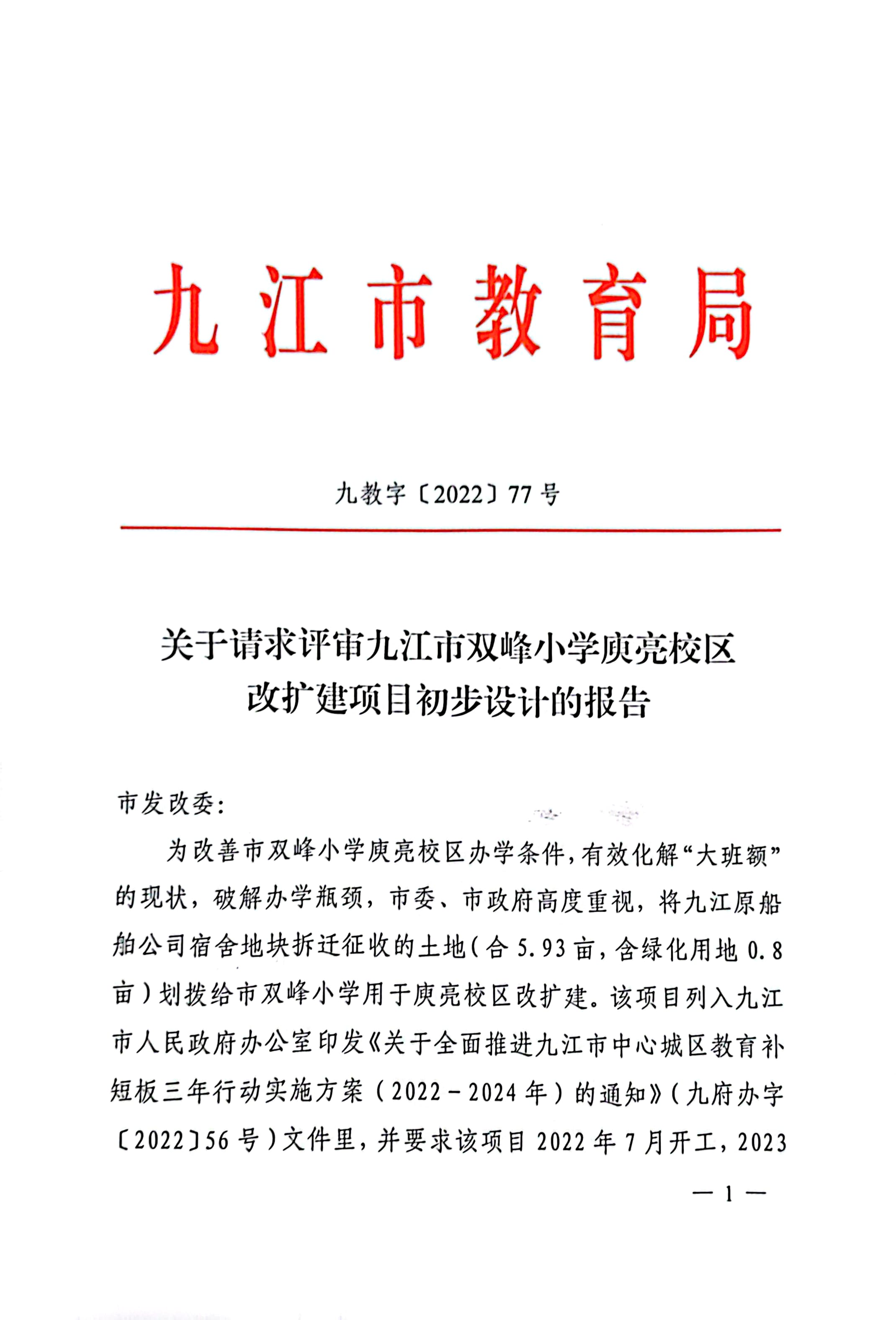 关于请求评审九江市双峰小学庾亮校区改扩建项目初步设计的报告
