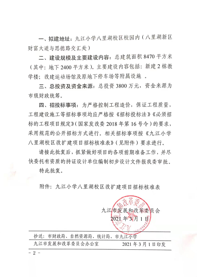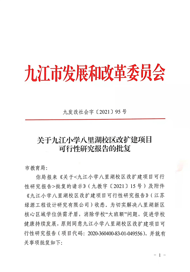九江小学八里湖校区改扩建项目可行性研究报告的批复