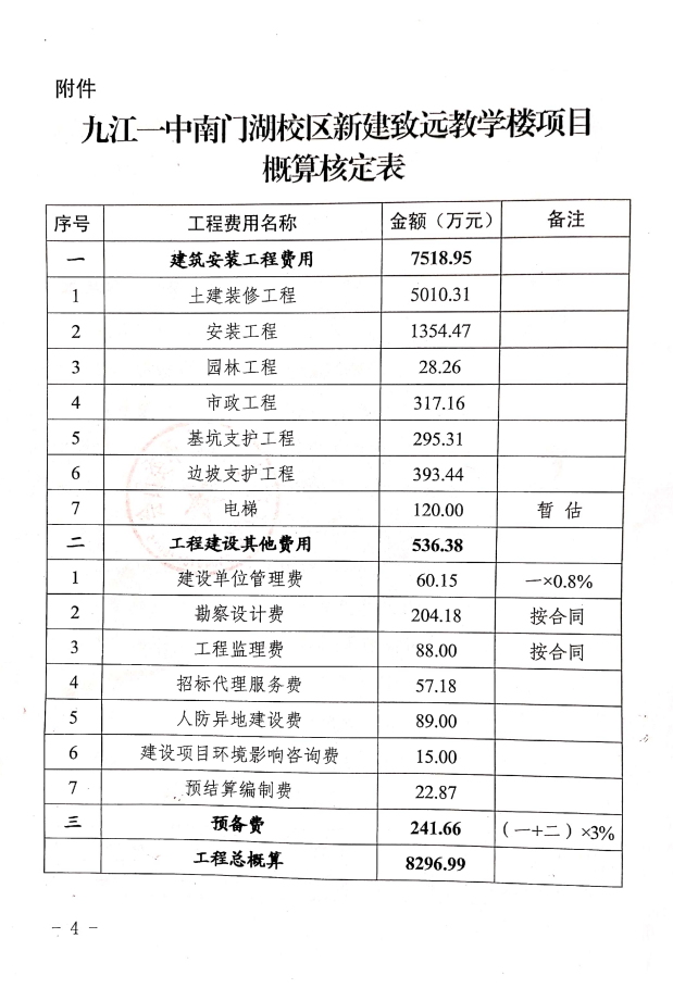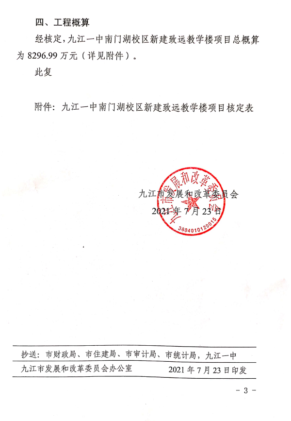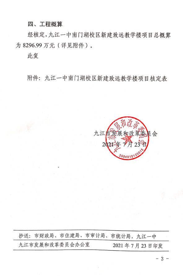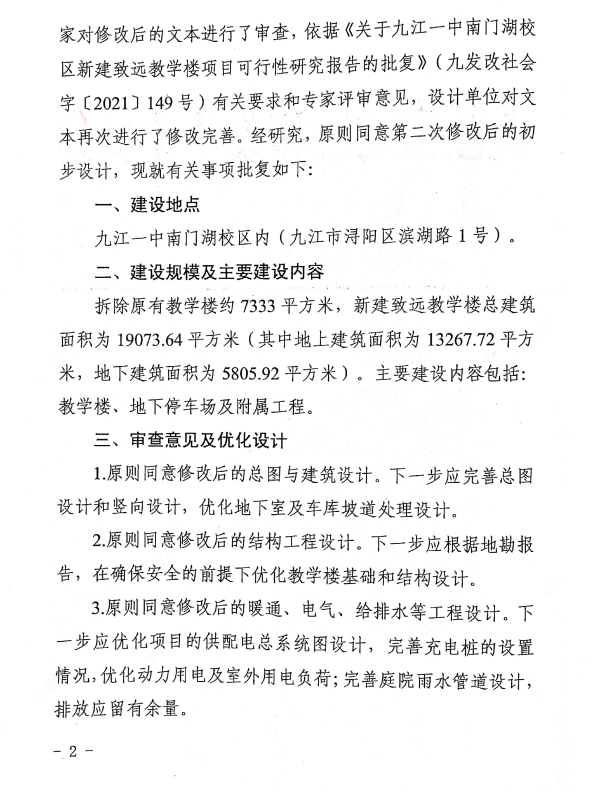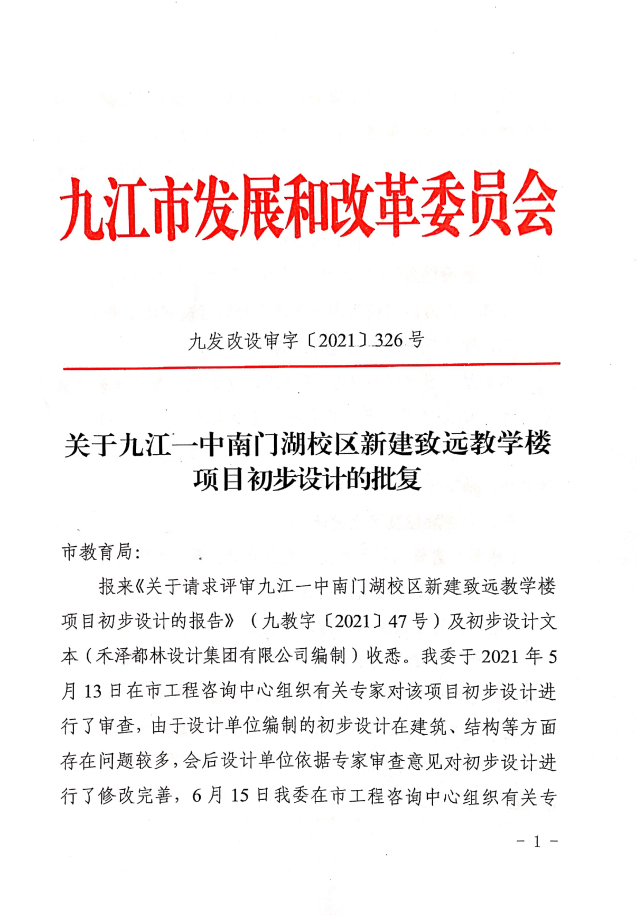 九江一中南门湖校区新建致远教学楼项目初步设计的批复