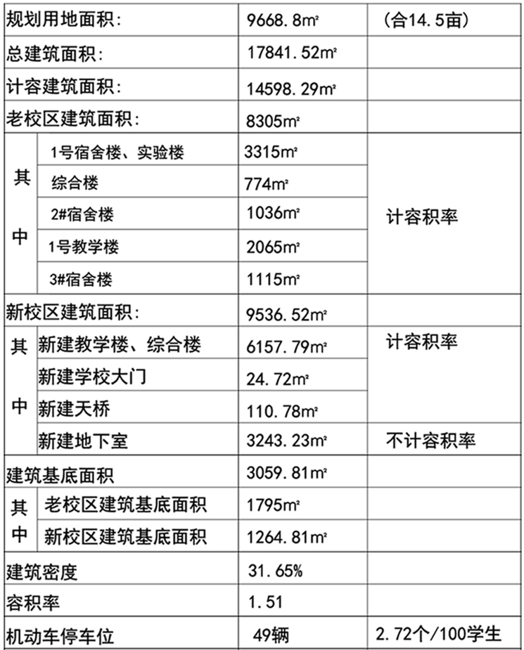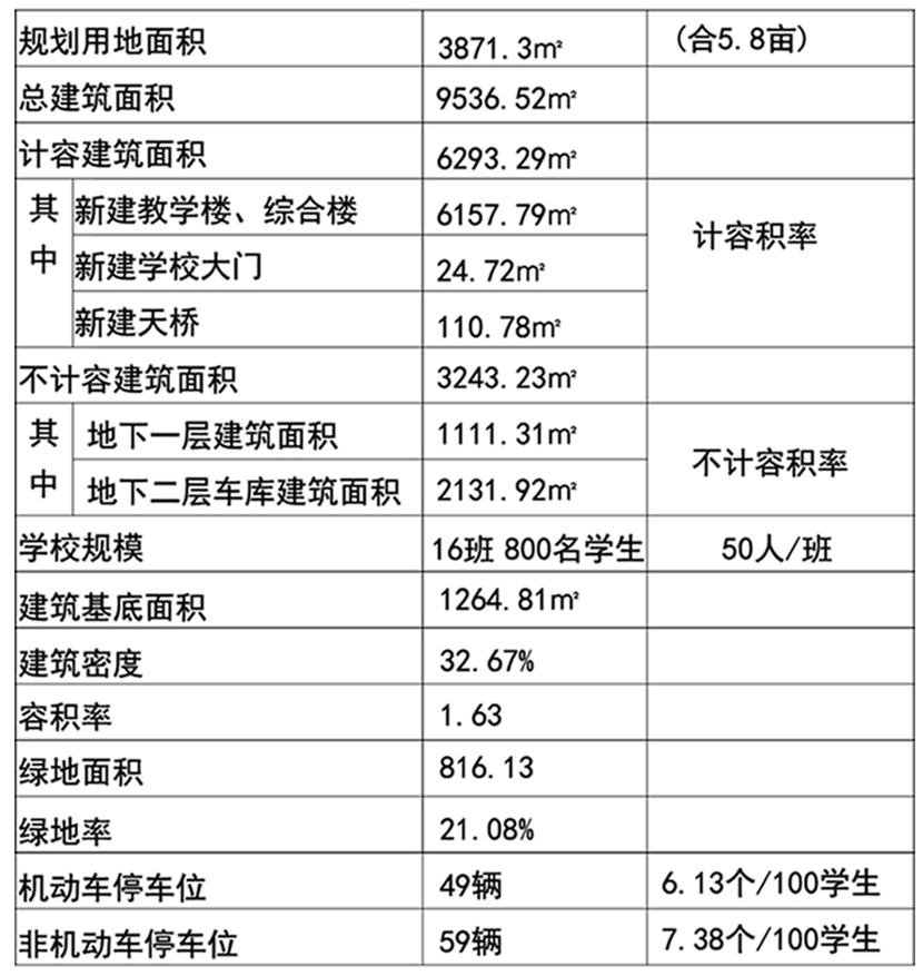 学校总办学规模36班(1800名学生),老校区改造内容为危楼拆除、场地改造翻新,新建部分用地面积3871.3平方米,拟新建一栋6层教学楼、综合楼。
