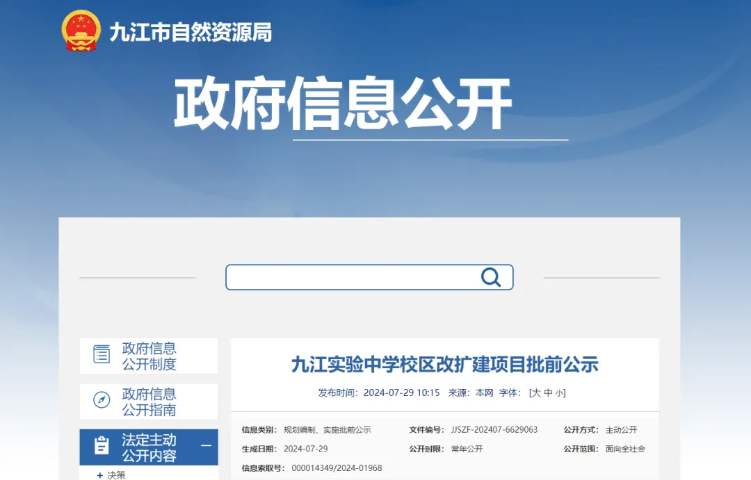 近日,九江市自然资源局官网发布了《九江实验中学校区改扩建项目批前公示》详情如下:九江实验中学校区改扩建项目批前公示
