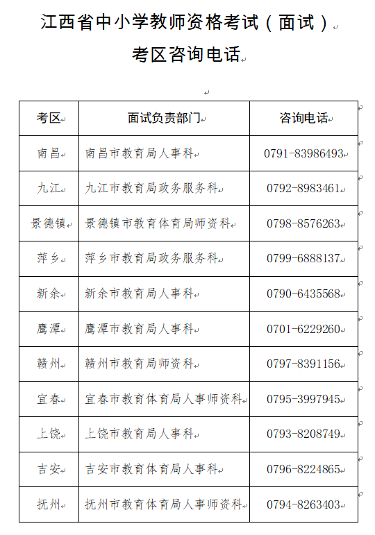(四)考生如有相关问题,可关注“中小学教师资格考试网”(https://ntce.neea.edu.cn)或“江西教育网”(http://jyt.jiangxi.gov.cn),了解中小学教师资格考试(面试)相关信息,也可以咨询相应考区(考区咨询电话见附件1)。