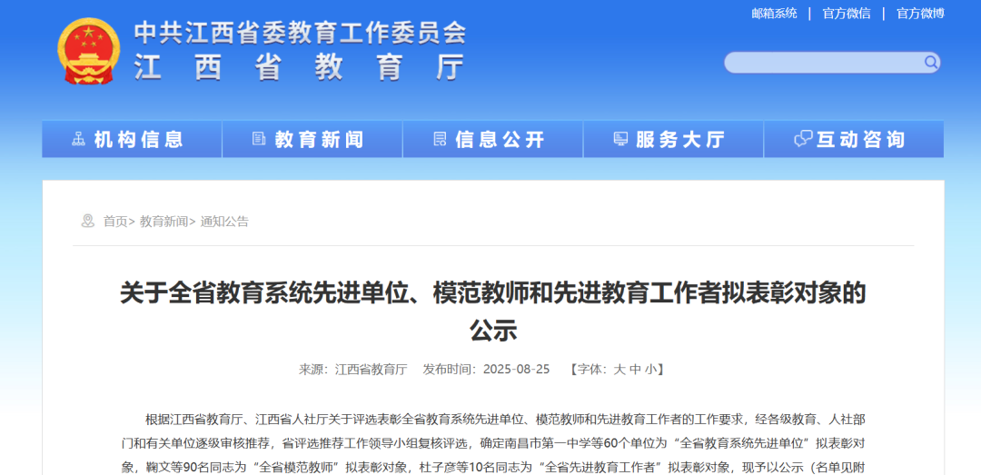 根据江西省教育厅、江西省人社厅关于评选表彰全省教育系统先进单位、模范教师和先进教育工作者的工作要求,经各级教育、人社部门和有关单位逐级审核推荐,省评选推荐工作领导小组复核评选,确定南昌市第一中学等60个单位为“全省教育系统先进单位”拟表彰对象,鞠文等90名同志为“全省模范教师”拟表彰对象,杜子彦等10名同志为“全省先进教育工作者”拟表彰对象,现予以公示(名单见附件,同时将6个备选对象一并公示)。