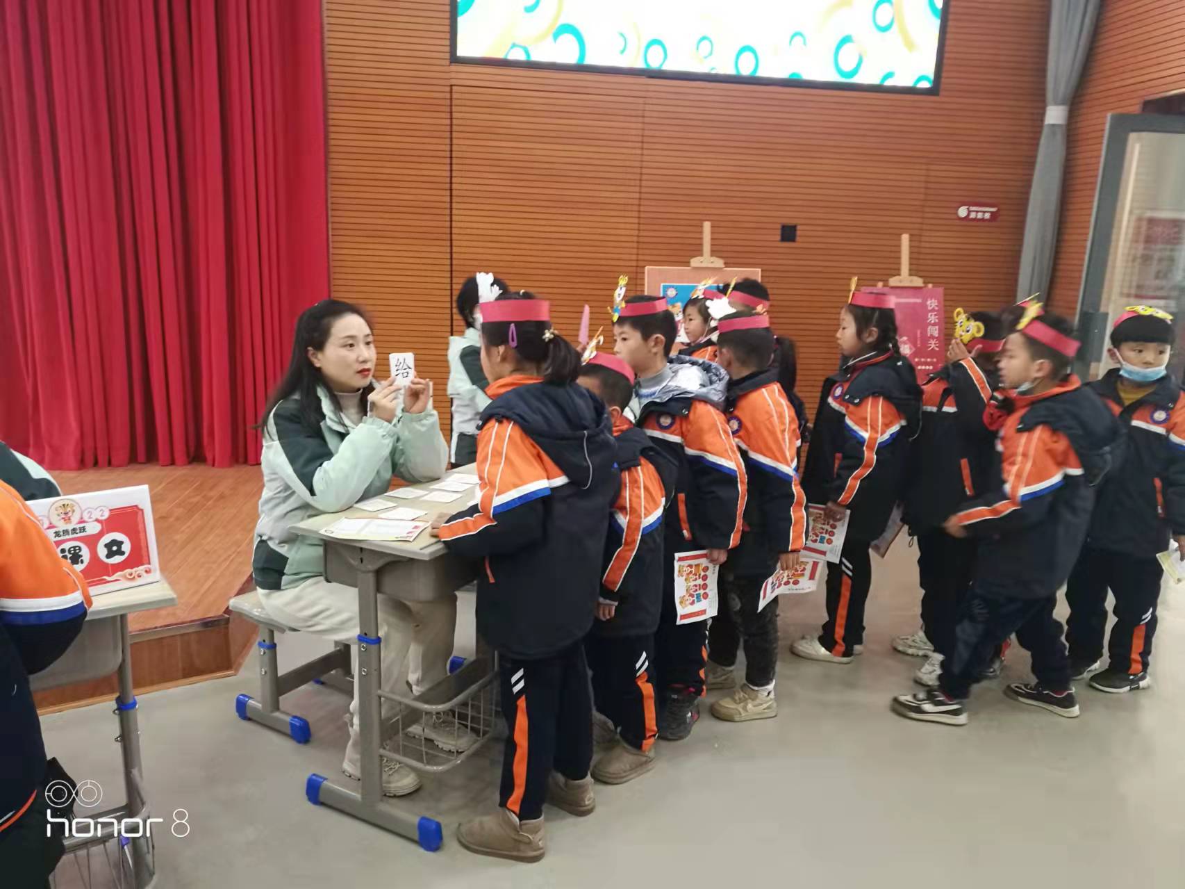 考核中,戴上萌虎头饰的“虎娃”们每人领到一张闯关卡,一个个信心十足、跃跃欲试地排着队进行闯关“游戏”。一年级的“虎娃”们要依次通过“虎虎生威拼拼音”“生龙活虎识字词”“龙腾虎跃诵课文”“虎脑风暴说口语”等语文关卡和“数字海洋游一游”“位置迷宫辨一辨”“钟面时间认一认”“看图列式说一说”等数学关卡。二年级的“虎娃”们则要依次通过“生字冒险岛”“诗文探秘岛”“想象飞行岛”等语文关卡和“扑克翻翻乐”“购物小达人”“图形小侦探”“时间小马车”等数学关卡。每个游戏关卡呈螺旋阶梯式上升,以读、认、说、背、算、摸、辨等不同方式检验孩子对知识要点的掌握情况。每一次闯关成功,“虎娃”们都能获得一枚印章奖励。闯关完成后,老师会根据奖章个数给“虎娃”们评定综合考核等级。成功闯完所有关卡的孩子们还可以和新春“福虎”一起合影留念,表达对新的一年的美好期许,稚嫩的脸庞上展露着自信与阳光。