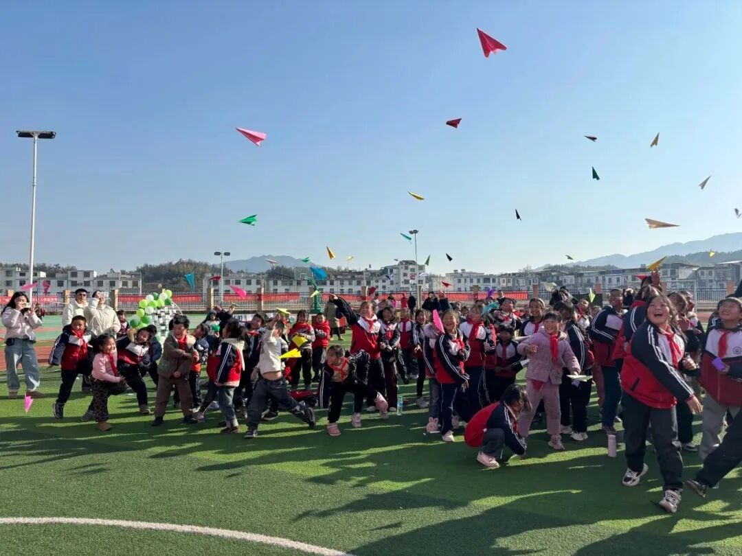 纸飞机放飞梦想环节,孩子们亲手折制纸飞机,并在飞机上写下自己的新年愿望和梦想。随着一阵阵欢呼声,纸飞机在蓝天白云下自由翱翔,带着孩子们的梦想与希望飞向远方。最后,学校还为每位留守儿童准备了精美的生日礼物,包括书籍、文具等学习用品,以及温暖的手套和零食。