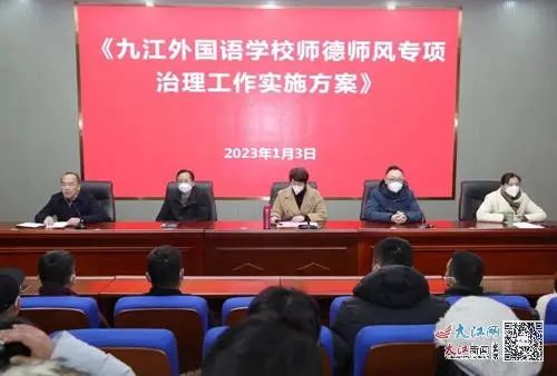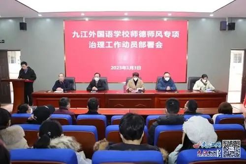 为加大师德师风建设力度,营造九江外国语学校风清气正、崇廉向善的新样态,1月3日,九江外国语学校在濂溪校区三楼多功能厅召开师德师风专项治理工作动员部署会。校长周卫华、党委书记田军等校级领导、全体教师参加会议。