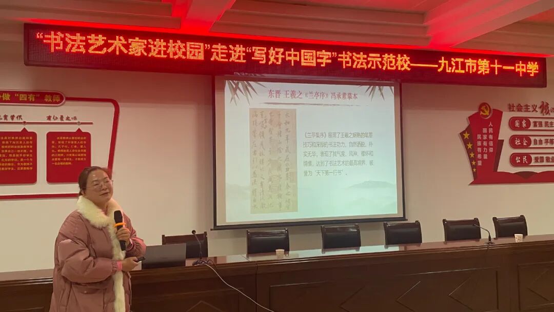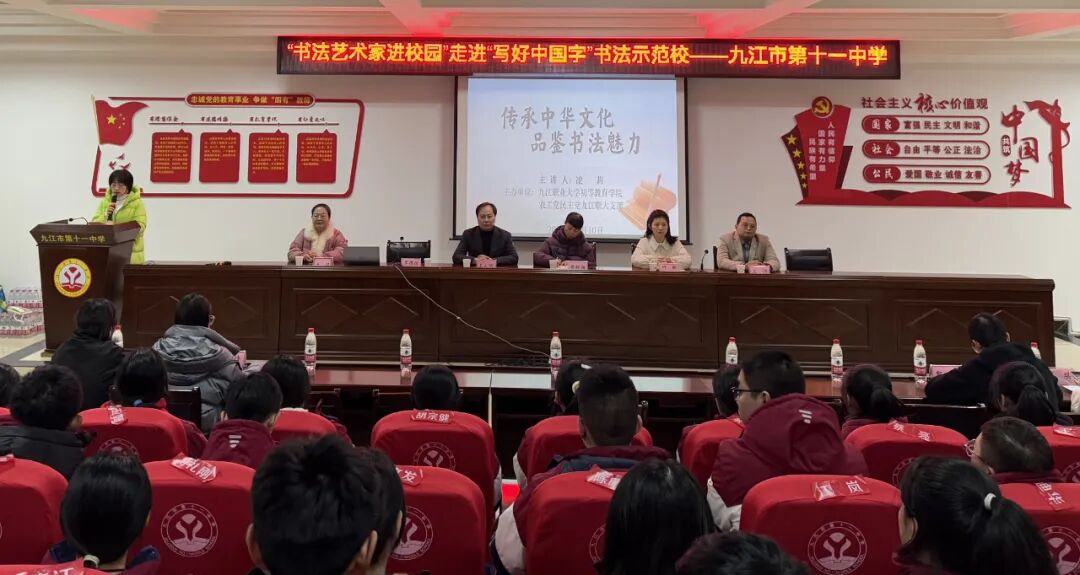为进一步丰富师生校园文化生活,加强书法示范校建设,12月10日,九江市市直教育联盟(市田家炳实验中学、市六中、市十一中)“书法艺术家进校园”走进“写好中国字”书法示范校活动在九江市第十一中学成功举行,联盟校美术教师代表及市十一中部分师生参与此次活动。