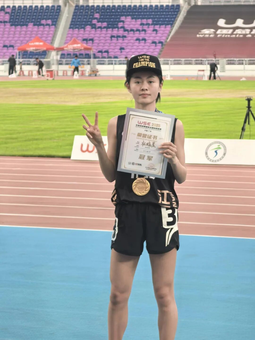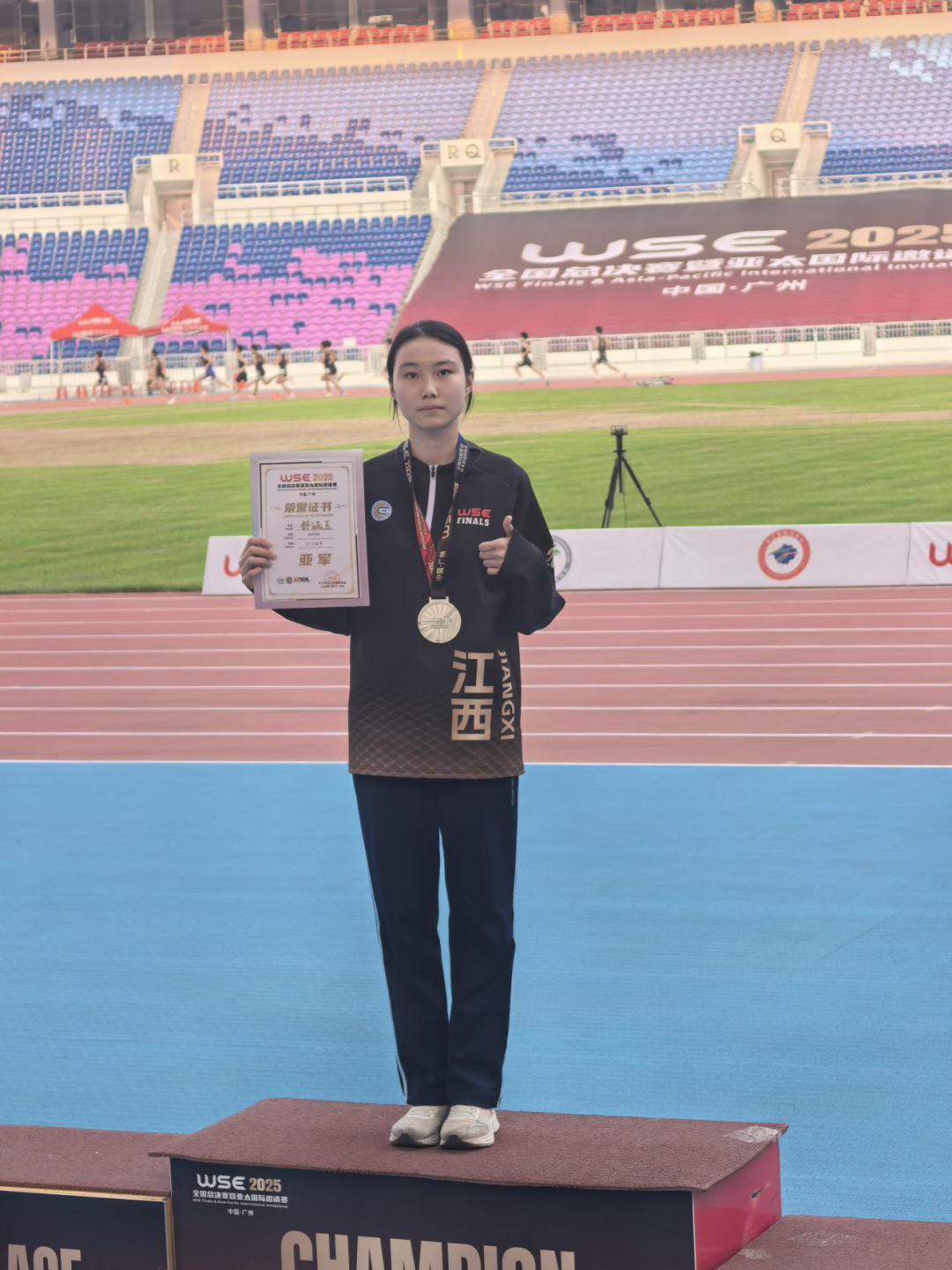 在为期两天的赛事中,九江七中学子展现出非凡的竞技状态与顽强的拼搏作风。尤为亮眼的是,舒涵玉同学在女子U13组800米和1500米项目中,不仅双双摘得银牌,更是一举打破了该两项13岁组的全国纪录,成为赛场瞩目的焦点。