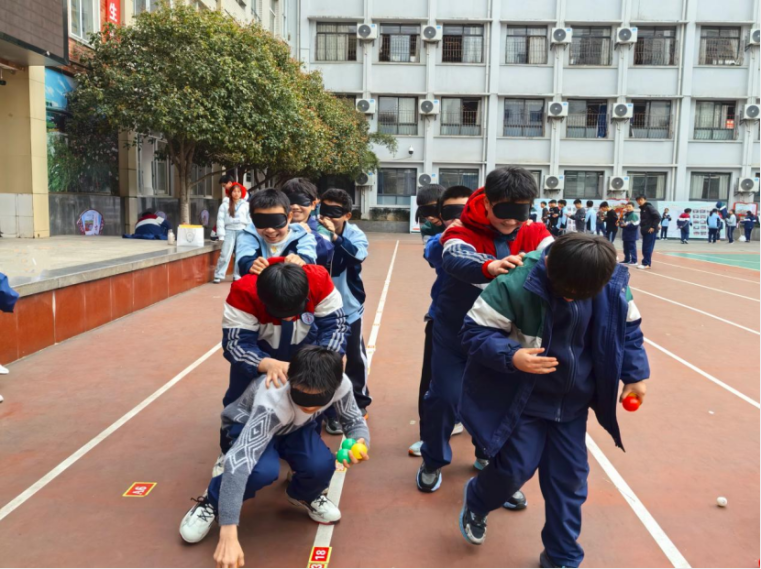 随后开展了“心链传声”活动,参与成员蒙眼后依次手搭前肩组成“心链”小分队,在规定区域内找到小球并运回终点,中途队伍不能断开。同学们在蒙眼协作捡球的过程中,慢慢战胜了对未知的恐惧,真切感悟到成员之间“责任共担”的重要性,也进一步强化了个体与集体的紧密联结感。