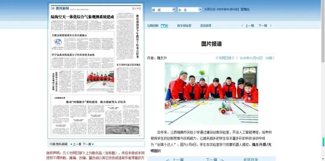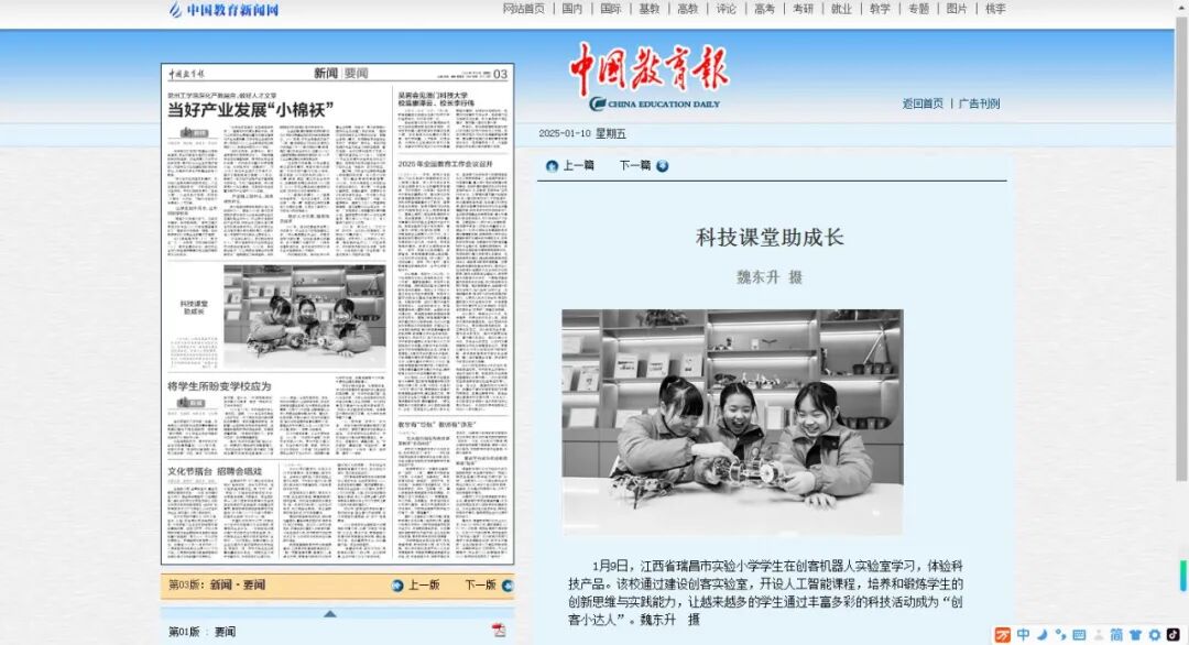 1月10日,《光明日报》《中国教育报》分别在08版和03版刊登瑞昌市实验小学科技创新活动新闻图片,点赞了学校积极创造条件,为学生搭建科创活动平台,让越来越多的学生成为“创客小达人”。