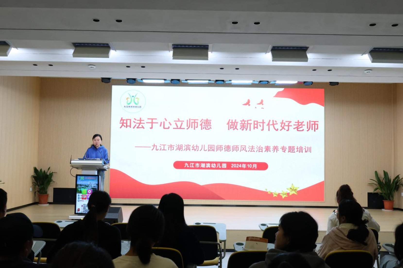 心装祖国的未来,手捧幼儿的明天。九江市湖滨幼儿园将以此次师德师风法治素养专题培训活动为契机,进一步强化法治进校园工作力度,充分发挥法治副校长引领作用,扎实开展法治教育活动,提高教职工的法律意识,把法治教育融入幼儿一日生活当中,从我做起,从身边做起,为全园幼儿平安、健康、茁壮成长保驾护航!