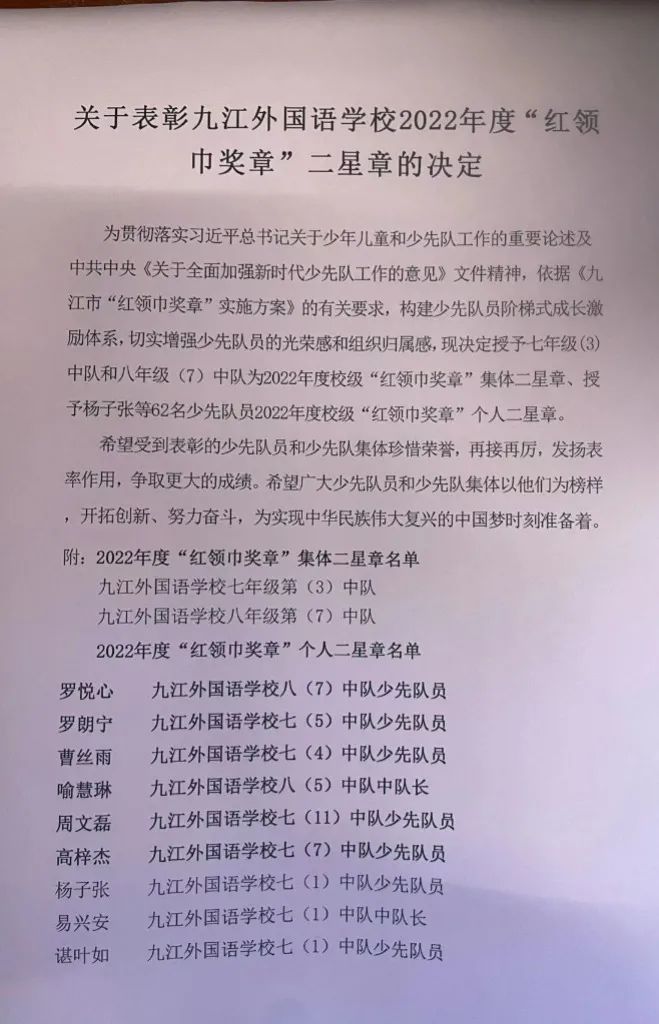为贯彻落实团中央、教育部、全国少工委联合印发的《关于构建阶梯式成长激励体系增强少先队员光荣感的指导意见》及团省委、省教育厅、省少工委关于印发《江西省“红领巾奖章”实施方案》的通知等文件精神,促进青少年德智体美劳全面发展,11月24日,九江外国语学校庾亮校区举行“红领巾奖章”争章活动启动仪式。受表彰的少先队员和少先队集体参加仪式。