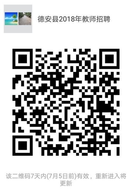 (九)请各位考生知悉公告内容后,自行扫码加入“德安县2018年教师招聘”微信群,入群时请注明“报考学段学科和姓名”,群二维码如下: