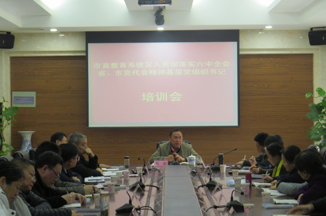 12月15日,为进一步掀起学习贯彻十八届六中全会和省市党代会精神热潮,扎实做好市直教育系统党建工作,市教育局党委采取以会代训的形势,组织召开市直教育系统贯彻落实十八届六中全会和省市党代会精神基层党组织书记培训会。会议为期一天,上午集中培训,下午分散学习。