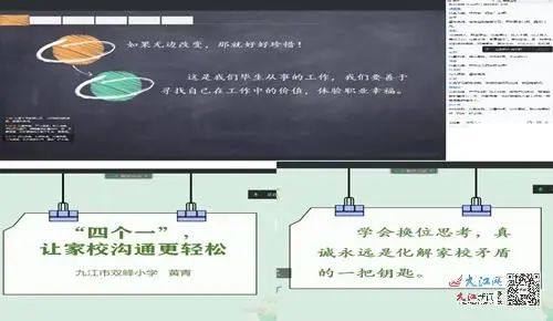 九江市“德艺双馨”教书育人楷模江海花老师、九江市师德师风先进个人黄升炉老师以及江西省辅导员技能大赛特等奖获得者黄青老师进行了大会发言。其中黄青老师她以“四个一,让沟通更轻松”为题,从她日常的班主任工作出发讲述了对待学生,处理班级事务时的方法和感受。爱每一个孩子、公平公正的对待每一位孩子、遇事多换位思考、真诚地与家长沟通等,用自己的实际行动践行着自己作为教师的誓言和家长一起做孩子成长路上的铺路石。