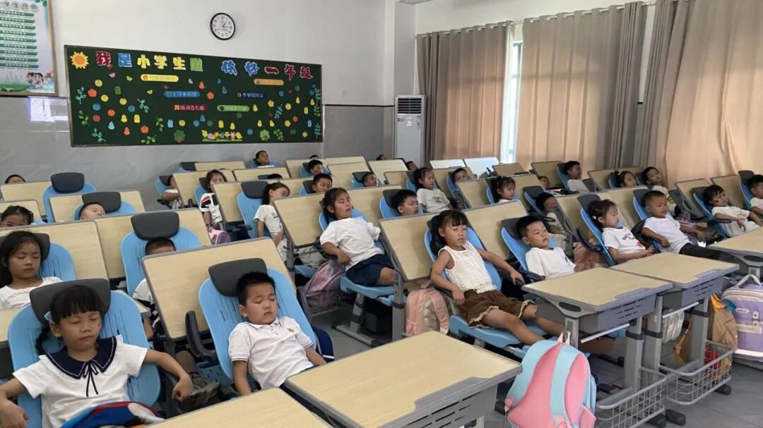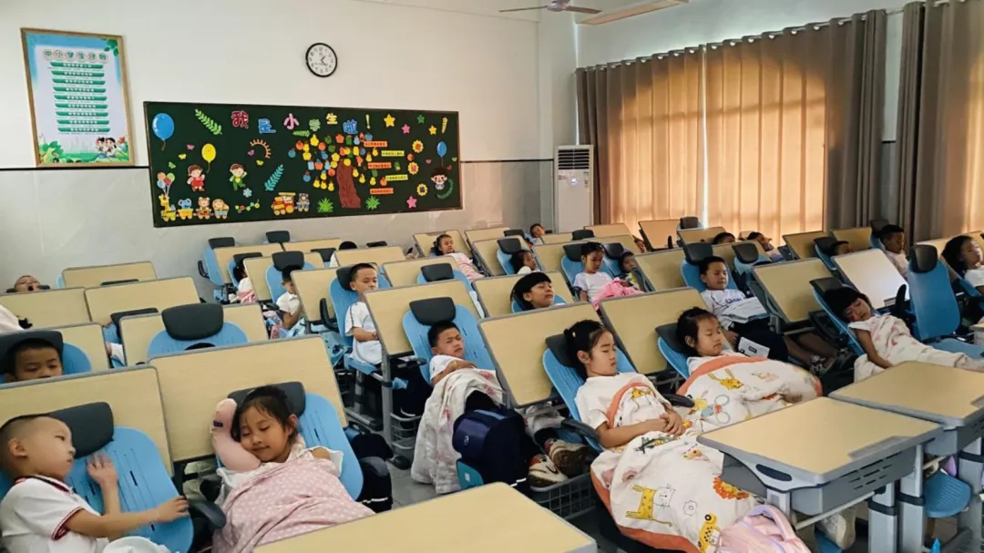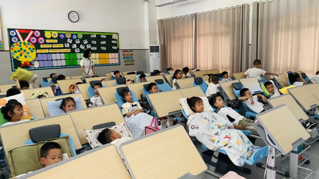 开学第一天,吃完午餐后,一年级的教室传来一阵阵惊叹声,原来是老师在教孩子们“变魔术”——看起来与普通桌椅并无二致课桌椅,在“一推”“一拉”间秒变“午睡神器”。