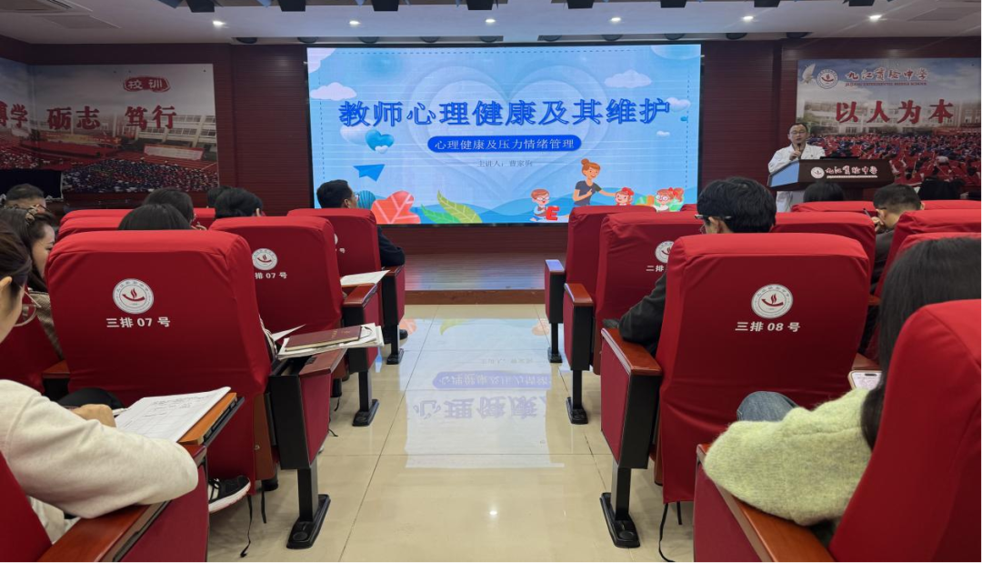 本次讲座特邀九江市第一人民医院心理健康专家曹家驹主任主讲。讲座围绕教师心理健康维护核心主题,系统梳理教师心理健康相关知识,阐释现代健康包含身体健康、心理健康与社会适应三大维度,帮助教师正确认识心理亚健康、心理障碍等问题,树立科学的健康观念。通过“人生三件事”“活在当下”的生活智慧,引导教师分清自身、他人与不可控之事,以平和心态面对工作与生活。