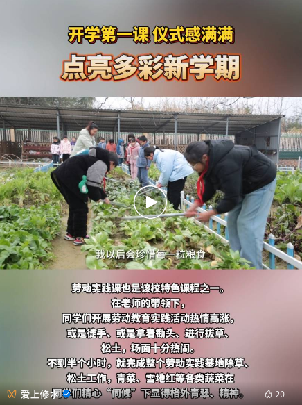 在修水县征村乡中心小学“开学第一课”在老师的带领下同学们开展劳动教育实践活动热情高涨,或是徒手、或是拿着锄进行拔草、松土……场面十分热闹不到半个小时就完成整个劳动实践基地除草、松土工作,青菜、雪地红等各类蔬菜在同学们精心“伺候”显得格外青翠、精神征村乡中心小学学生吴雨欣表示“只有付出才有回报劳动实践课让我更加懂得了粒粒皆辛苦的真正含义我以后会珍惜每一粒粮食也会尊重每一位劳动者。”
