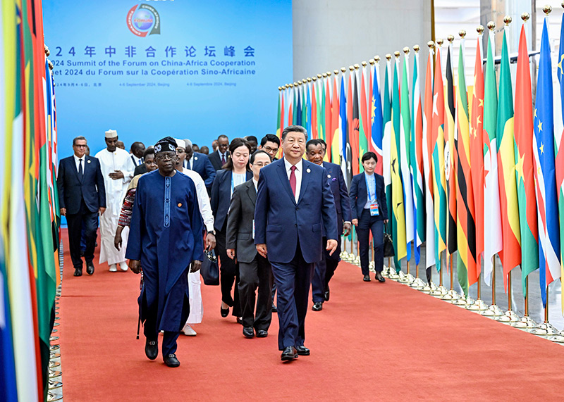 9月5日上午,国家主席习近平在北京人民大会堂出席中非合作论坛北京峰会开幕式并发表主旨讲话。这是习近平同外方领导人共同步入会场。新华社记者 殷博古 摄